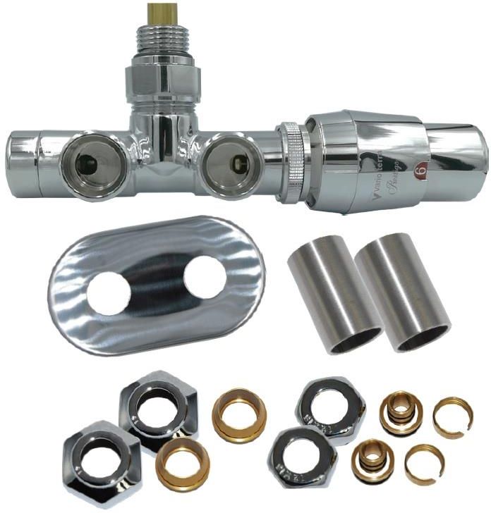 Varioterm Unico All in One AUGS0203CFK/P zintegrowany zestaw termostatyczny z rurką zanurzeniową, tuleje i maskownica, adaptery, wersja prawa kolor satyna przeznaczenie: instalacja c.o. o rozstawie 50mm, podłączenie do jednego pionowego kolektora grzejnika (rurka zanurzeniowa), nastawa wstępna: na wkładce zaworu odcinającego, głowica termostatyczna do montażu od strony powrotu, w komplecie: głowica termostyczna "Prestige", zawór kątowy, rurka zanurzeniowa, podwójna rozeta maskująca, tuleje maskujące (2x), adaptery (złączki zaciskowe), adaptery/złączki: do wyboru PEX 16x2 lub Cu (miedź), zawór zintegrowany kątowy, figura prawa, kolor: satyna. Uwaga! Na zdjęciach znajduje się zestaw w kolorze chrom. Przedmiotem sprzedaży jest zestaw w kolorze satyna.