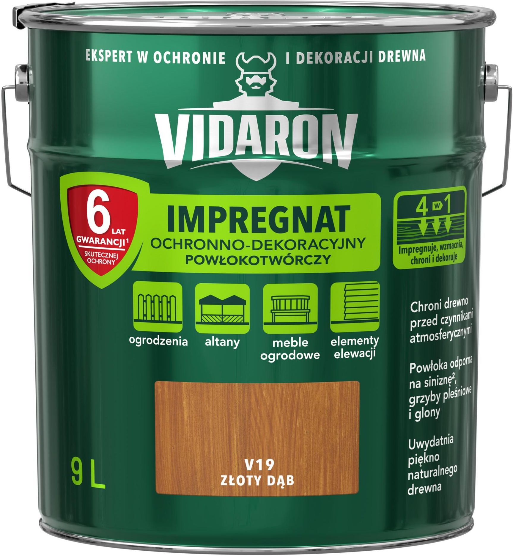VIDARON Impregnat Ochronno-Dekoracyjny Powłokotwórczy Pojemność: 9L | Kolor: V19 złoty dąb | Efekt wykończenia: mat ZASTOSOWANIE Drewno Ogrodzenie Altana Meble ogrodowe Pergola Drewutnia DOSTĘPNE KOLORY OPIS PRODUKTU Impregnat powłokotwórczy, przeznaczony do ochrony i dekoracji drewna, …