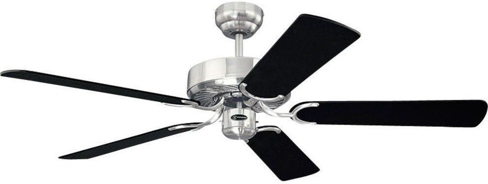 Wentylator sufitowy bez oświetlenia Cyclone 78370 czarny Westinghouse. STYLIZACJA Wentylator sufitowy stworzony w prostym stylu, w kolorach, ktore nigdy nie przestaną być modne. Klasyczna konstrukcja śmigła tworzy oryginalną atmosferę. Korpus wentylatora jest w kolorze polerowanej stali, do którego jest przyłączone 5 śmigieł (łopatek) w kolorze czarnym z jednej strony, a z drugiej w kolorze czarnym ze srebrnymi paskami. Łopatki wentylatora są wykonane z MDF, ze specjalnie wyprofilowanymi krawędziami natarcia. Oznacza to, że model jest bardzo cichy, a dzięki dopracowanej stylistyce pasuje idealnie do takich pomieszczeń jak sypialnia, czytelnia, gabinet. ZASTOSOWANIE Urządzenie ma możliwość zmiany rotacji łopatek dla poprawienia cyrkulacji powietrza w pomieszczeniach zarówno w sezonie letnim jak i zimowym. Przełącznik zmiany kierunku rotacji znajduje się w korpusie wentylatora ( nie ma go w panelu sterowania), lecz zmiana nie wymaga demontażu urządzenia. Lato - rotacja wentylatora w kierunku przeciwnym do wskazówek zegara Wentylator sufitowy Westinghouse Cyclone daje możliwość zmiany ustawień termostatów i dzieki temu pozwala ograniczyć nakłady na energię. Latem wentylator sufitowy kieruje powietrze w dół, dzięki temu daje uczucie przyjemnego chłodu. Badania wykazały, że większość ludzi przebywająca w pomieszczeniach, w których pracowały wentylatory sufitowe odczuwała temperaturę co najmniej o 4°C niższą niż ustawiona na termostatach urządzeń klimatyzacyjnych w pomieszczeniach. Prosimy jednak pamiętać, że wentylatory sufitowe dają jedynie subiektywne uczucie chłodu dla osób przebywających w pomieszczeniach, ale nie zmniejszają temperatuty otoczenia. Dlatego prosimy pamiętać o wyłączaniu ich przy opuszczeniu pomieszczenia. Zima – rotacja wentylatora zgodna z kierunkiem wskazówek zegara W sezonie zimowym wentylator sufitowy wentylator Westinghouse daje możliwość zaoszczędzenia energii dzięki ustawieniu pracy urządzenia na małą predkość rotacji zgodną z kierunkiem ruchu wskazówek zegara. Dzięki temu ciepłe powietrze przy suficie będzie mieszało się z chłodniejszym powietrzem z dolnej części pomieszczenia. Wentylator Westinghouse poprawia wydajność systemu ogrzewania do tego stopnia, że pozwoli ograniczyć wydatki na energie aż do 30%! KONSTRUKCJA Wentylator sufitowy jest wyposażony w silnik o 3 stopniach prędkość pracy, dzięki któremu użytkownik ma możliwość precyzyjnej regulacji stopni nawiewu. Średnica 132 cm daje możliwość efektywnej pracy w dużych pomieszczeniacho 25 m². Pozostałe wymiary urządzenia widnieją na schemacie obok. Ten model nie posiada zintegrowanego światła. STEROWANIE Wentylator jest sterowany przy pomocy sznurka, przymocowanego do silniczka w środkowej części urządzenia. Pociągnięcie za sznurek umożliwia włączenie wentylatora oraz ustawienie prędkości maksymalnej. Kolejne trzy pociągnięcia zmniejszają obroty wentylatora, natomiast czwarte wyłącza wentylator. Możliwe jest dokupienie pilota lub sterownika ściennego(sekcja Akcesoria). MONTAŻ Z montażem wentylatora ściennego Westinghouse przy pomocy instrukcji poradzi sobie każdy. System mocowania Dual Mount Podczas instalacji wentylatora sufitowego Westinghouse z systemem mocowania "Dual Mount System" możliwe jest użycie prętu montażowego, który jest częścią zestawu. Wentylator może być także instalowany bez prętu co zmniejszy jego wielkość (polecane do niskich sufitów). Do wysokich pomieszczeń jest możliwość dokupienia prętu przedłużającego 30,5 cm lub 46 cm ( w sekcji Akcesoria).