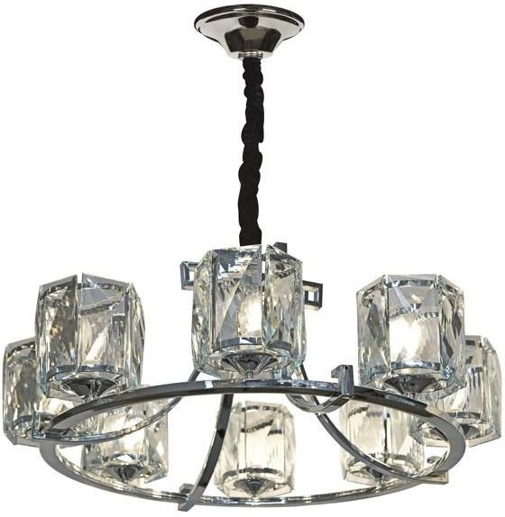 Wisząca lampa ze szklanymi kloszami. Elegancji i stylu dodają wykończenia w kolorze srebra. Materiał: kryształ, metal galwanizowany Kolor: chrom, transparentny Moc: 8xE14 max 40W Wysokość regulowana 50-105cm