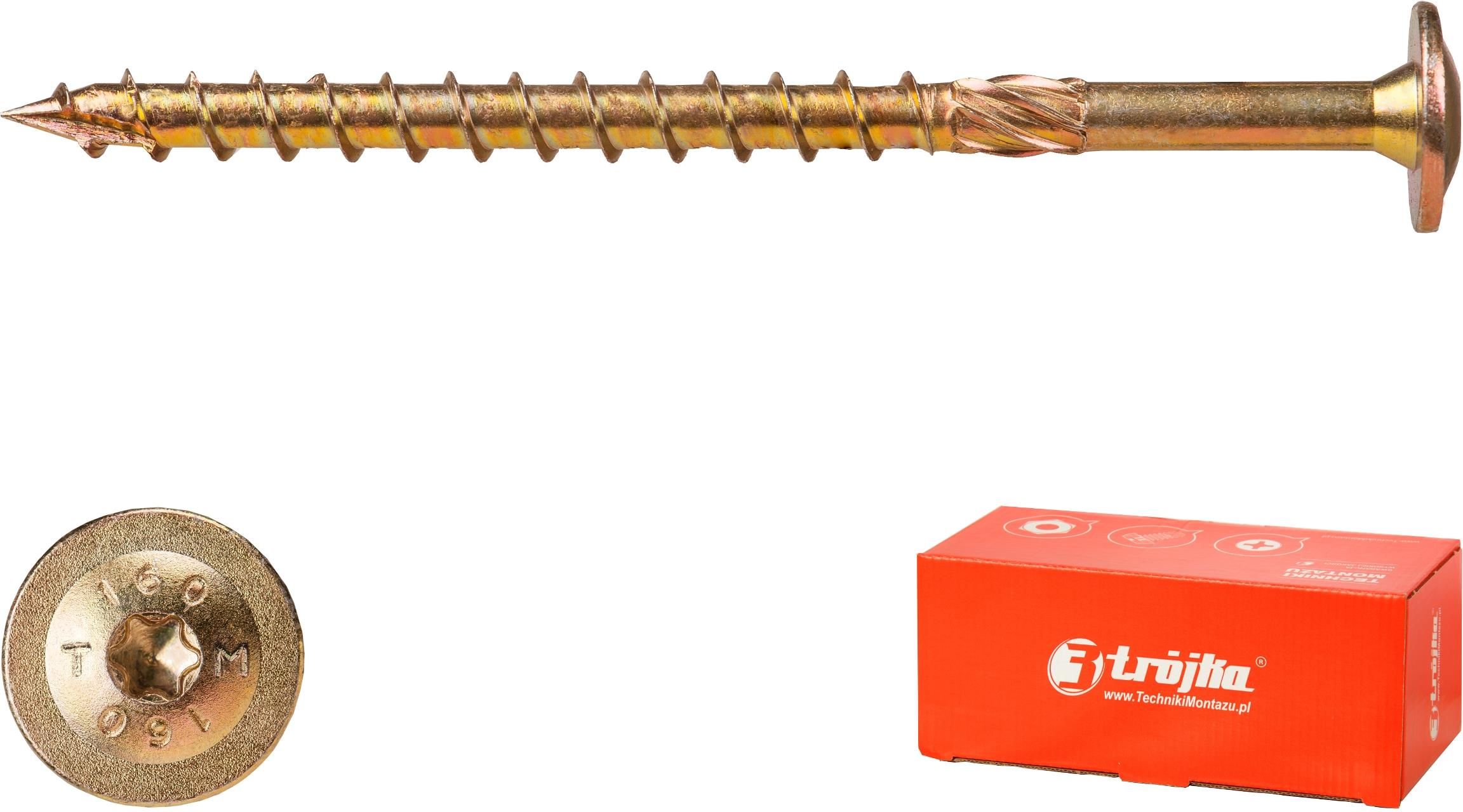 Wkręty hartowane ciesielskie z łbem podkładowym TORX - 8x280mm - 50 sztuk TRÓJKA SKAWINA- jesteśmy polską firmą, która charakteryzuje się najwyższej jakości produktami. Firma zyskała uznanie dzięki swojemu profesjonalizmowi, szerokiemu asortymentowi produktów oraz wysokiej jakości obsłudze klienta. Wkręty Ciesielskie hartowane TORX TRÓJKAz łbem podkładkowym (talerzowym) o innowacyjnej konstrukcji, dzięki polepszonym zdolnością do wkręcania się, usprawniają pracę przy montażu konstrukcji drewnianych oraz zapewnia odpowiednią wytrzymałość całej konstrukcji. Wkręty ciesielskie hartowane TORX firmy TRÓJKA zapewniają komfortową pracę przy montażu dzięki: wgłębieniu typu TORX, specjalnej końcówce wiercącej posiadającej karby tnące, frezie rozwiercającym zmniejszającym tarcie w trakcie wkręcania. Łeb podkładkowy zapewnia większą powierzchnię docisku. Wkręt całkowicie zastępuje gwoździe, przy montażu nie jest wymagane wstępne nawiercanie konstrukcji. Produkt wykonany wg europejskich norm: PN-EN 14592:2008+A1:2012 , posiada certyfikaty i aprobaty. ZALETY ORYGINALNA ETYKIETA TRÓJKA. Dzięki temu wiesz, że kupujesz bardzo dobry, oryginalny produkt, ✅ Jakość zatwierdzona atestem PN-EN 14592:2008+A1:2012 Deklaracja Właściwości Użytkowych, ✅ Wykonano ze stali węglowej, wzmocniony przez proces hartowania, ✅ Ochronę antykorozyjną zapewnia ocynk galwaniczny, ✅ Pasywacja ocynku na kolor złoty idealnie komponuję się z kolorem drewna, ✅ Estetyczne pudełko, zapewnia bezpieczne przechowywanie produktu, ✅ Wykonane w najwyższej jakości, ✅ Nowoczesne procesy produkcji. ✅ PARAMETRY Sprawdź kluczowe dane techniczne produktu: Średnica wkręta [d]: 8 mm Długość wkręta [L]: 280 mm Średnica łba [D]: 22 mm Długość gwintu [L1]: 80 mm Długość frezu [L2]: 12 mm Gniazdo TORX: TX 40 Ilość w opakowaniu jednostkowym (opJ): 50 sztuk Norma: PN-EN 14592:2008 1A:2012 Powłoka: Ocynk galwaniczny Cechy wkręta Nacięcie TORX (gniazdo) TX40 - gniazdo TORX zapewnia optymalne przeniesienie momentu obrotowego. Łeb podkładkowy (główka) - zapewnia zwiększoną powierzchnię docisku Frez rozwiercający - frez rozwiercający zmniejsza moment obrotowy oraz chroni drewno przed rozczepieniem Karby tnące - karby tnące umieszczone na początku gwintu przecinają włókna struktury drewna Specjalny frez na ostrzu - ułatwia rozpoczęcie montażu wkręta oraz zapobiega pękaniu drewna