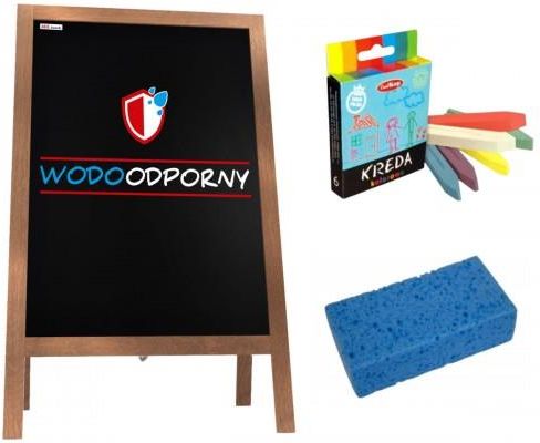 Potykacz kredowy 118x61cm stojak lokal restauracja Potykacz stojak kredowy 118 cm x 61 cm POWIERZCHNIA - potykacz wyposażony jest w czarną, kredową tablicę do pisania, wykonaną z płyty HDF o wysokiej gęstości. Jest bardzo trwała, można po niej pisać kredą oraz markerami kredowymi. Płyta znajduje się z obu stron produktu, co czyni go dwustronnym! RAMA - potykacz wykonany jest z wysokiej jakości drewna. Zostało ono polakierowane, co zapewnia mu elegancki brązowy kolor, zachowując przy tym naturalną strukturę drewna i układ słojów. WYKORZYSTANIE - stojak kredowy jest doskonałym nośnikiem reklamy i informacji. Dzięki powierzchni wielokrotnego użytku, można umieszczać tam na bieżąco informacje o lokalu, aktualne menu, specjalne oferty, wskazówki na temat dotarcia do lokalu lub firmy. UNIWERSALNY - potykacz reklamowy pasuje do każdego miejsca! Wykorzystasz go w: restauracji, firmie, lokalu, barze, kawiarni, kwiaciarni, lodziarni. Jest też świetną tablicą do wykorzystania w domu, jako tablica kreatywna dla dziecka! GOTOWY DO UŻYCIA - potykacz jest gotowy do użycia natychmiast po wyjęciu z pudełka. Nie musisz nic skręcać, sklejać ani łączyć! Zapewniamy komfortowe i łatwe użytkowanie! POLSKA PRODUKCJA - nasz potykacz to produkt w pełni zaprojektowany i wyprodukowany w Polsce. Stworzony z pasją, co zapewnia wysoką jakość i dbałość o szczegóły. Jest niezawodnym rozwiązaniem dla Twojej firmy! Wymiary szerokość całkowita: 61 cm wysokość całkowita: 118 cm rozmiar wewnętrzny: 80x53 cm szerokość listwy: 4 cm grubość listwy: 2 cm wysokość nóżki: 30 cm W zestawie znajduje się również łańcuszek połączeniowy! Solidna konstrukcja Sercem potykacza jest solidna drewniana lakierowana konstrukcja. Przykuwa uwagę Klienta i zapewnia długie użytkowanie bez utraty walorów estetycznych. Uniwersalny i praktyczny Potykacz firmy ALLboards jest bardzo uniwersalny. Możesz wykorzystać go wszędzie gdzie tylko zechcesz, w szczególności: w restauracji w sklepie w kawiarni w kwiaciarni w pubie w barze Jego elegancki wygląd pasuje również do wykorzystania wewnątrz firmy czy też prywatnego domu! Nośnik informacji Dzięki potykaczowi przekażesz swoim Klientom wszystkie niezbędne informacje: informacje o swoim lokalu menu specjalne oferty wskazówki na temat dotarcia do lokalu/firmy Nic nie stoi na przeszkodzie, aby potykacz ozdobić również przykuwającymi uwagę rysunkami! GĄBKA I MARKER KREDOWY GRATIS!
