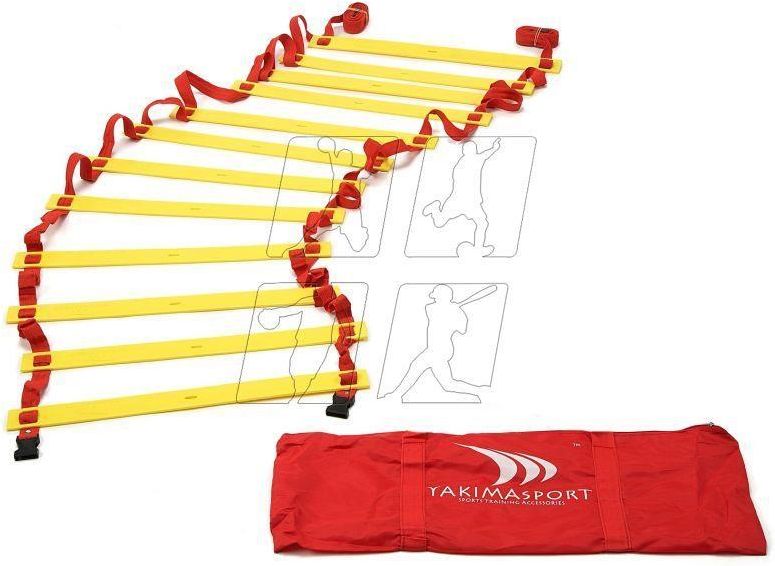 Drabinka koordynacyjna na halę 6 m Yakima Właściwości: treningowa drabinka koordynacyjna przeznaczona do użytku na hali długość drabinki to 6 metrów odporna guma nie ślizga się na podłożu szczeble połączone są taśmami tekstylnymi posiada klamry umożliwiające dołączenie kolejnej drabinki w skład zestawu wchodzi tekstylny pokrowiec do wygodnego transportowania Materiał: tworzywo sztuczne Kolor: żółte szczebelki czerwone taśmy