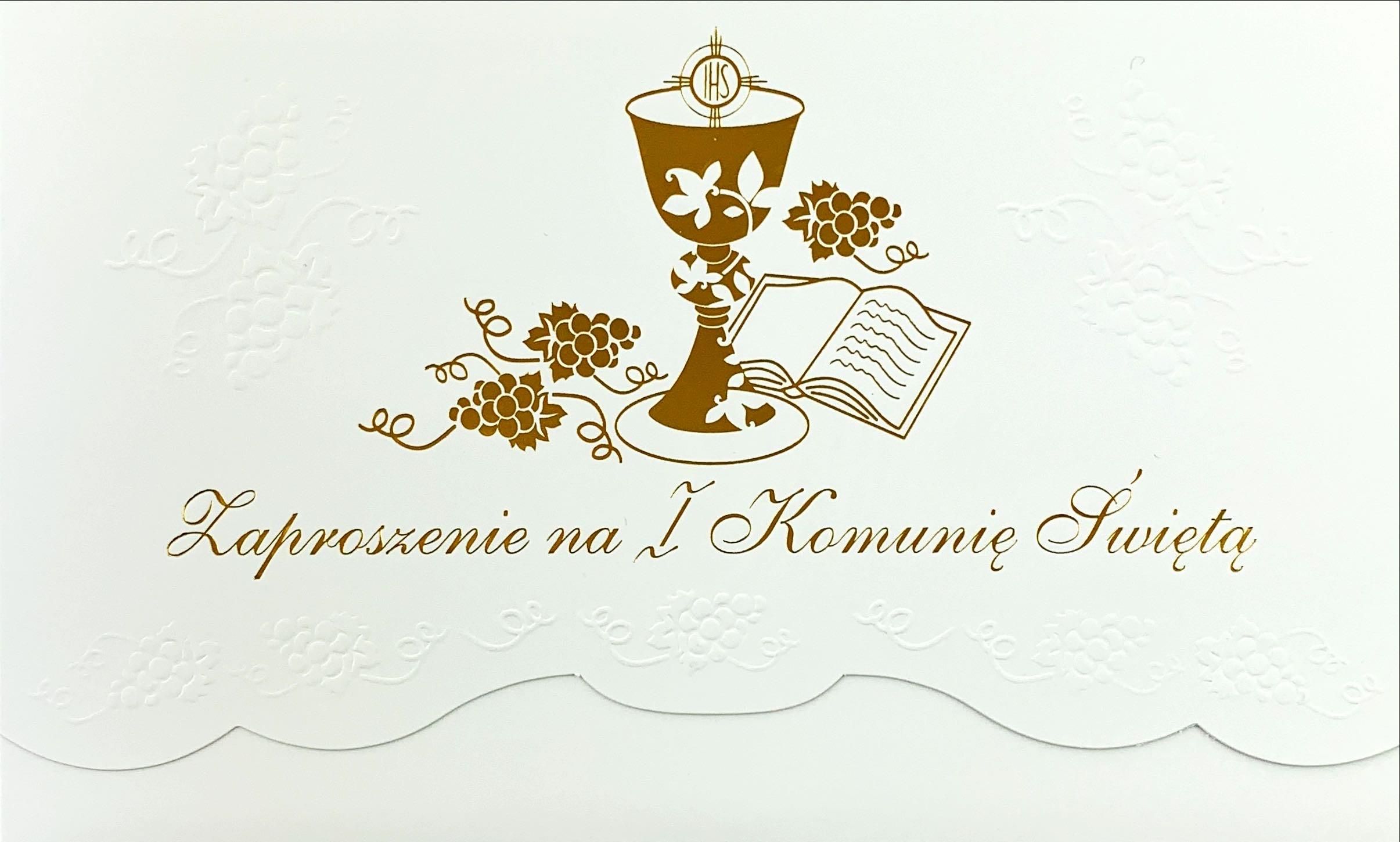 Zaproszenie na komunię, składane na 3 części, tłoczone i pozłacane, wykonane na białym papierze ozdobnym. Koperta w zestawie.