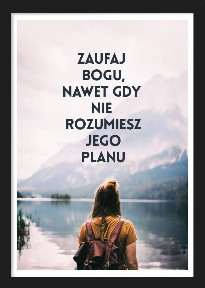 Zaufaj Bogu, nawet gdy nie rozumiesz Jego planu Wyjątkowy plakat z przesłaniem na każdy dzień w eleganckiej ramce w kolorze czarnym. Do zawieszenia na ścianie lub postawienia na biurku. Autorska grafika!