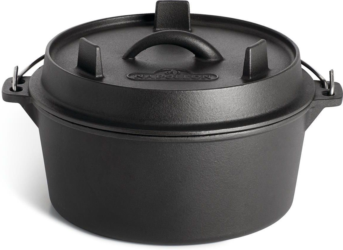 Żeliwny kociołek holenderski 4,5l marki Napoelon idealnie nadaje się do powolnego grillowania dla dużej liczby gości. Żeliwo jest jednym z najlepszych przewodników ciepła, rozprowadzając je i zatrzymując przez długi czas, aby dania były ciepłe. Używaj go w dowolnym miejscu, na kuchence lub w piekarniku, na grillu i na bocznych palnikach, na węglu drzewnym lub bezpośrednio w węglu, a nawet na swoim palenisku. Ten uniwersalny żeliwny kociołek doskonale nadaje się do gotowania zup, gulaszu, fasoli, a nawet pieczenia chleba. Zarówno pokrywa, jak i dno mają zintegrowane nóżki. Pokrywka pełni podwójną funkcję – może służyć jako żeliwna patelnia. • Świetnie sprawdza się na grillu gazowym i węglowym, nad ogniskiem, w domu w piekarniku czy na kuchence. • Żeliwo gwarantuje doskonałe zatrzymywanie i rozprowadzanie ciepła, a co za tym idzie – równomierne gotowanie. • Zintegrowane nóżki zapewniają przepływ powietrza potrzebny do grillowania na węglu drzewnym. • Dwufunkcyjna pokrywka po odwróceniu może służyć jako powierzchnia do grillowania. • Zintegrowany uchwyt pokrywki ułatwia odkrywanie i przykrywanie żeliwnego kociołka holenderskiego. • Wbudowany uchwyt na części głównej kociołka pozwala na jego łatwe przenoszenie i przestawianie.