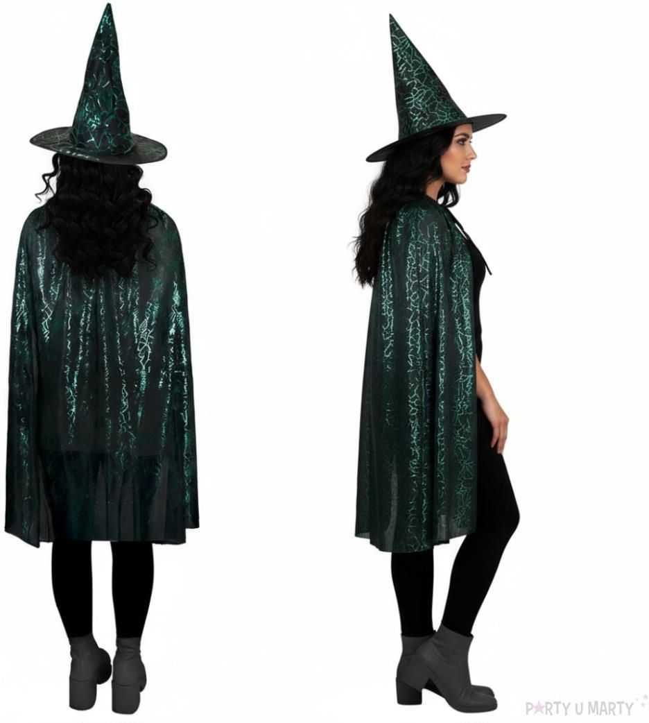 Strój czarownika- Przebranie Halloween peleryna i kapelusz z pajęczyną Przenieś się do świata magii i tajemnic dzięki wyjątkowemu zestawowi czarownika na Halloween! Komplet zawiera efektowną czarną pelerynę oraz klasyczny stożkowy kapelusz czarodzieja, ozdobione połyskującym nadrukiem pajęczyn i pająków w metalicznym, zielonym odcieniu. To stylowy i zarazem mroczny dodatek, który sprawdzi się podczas każdej halloweenowej zabawy. Peleryna o długości 112 cm wiązana jest wygodnie pod szyją, dzięki czemu dobrze układa się w ruchu. Kapelusz (37 × 33 cm) posiada szerokie rondo i usztywnianą formę, co zapewnia stabilność i efektowny wygląd. Lekki, transparentny materiał z metalicznym nadrukiem daje niesamowity efekt w świetle reflektorów, świec czy lampionów. Ten zestaw czarownika z peleryną i kapeluszem to idealny wybór, jeśli chcesz wyróżnić się podczas Halloween i wprowadzić do swojej stylizacji nutę magii i mrocznego klimatu. ✨? Charakterystyka produktu Motyw: pajęczyny i pająki w zielonym, metalicznym połysku. Peleryna: długość 112 cm, lekka, wiązana pod szyją. Kapelusz: klasyczny stożkowy, rozmiar 37 × 33 cm. Materiał: poliester z połyskującym nadrukiem. Rozmiar uniwersalny: odpowiedni dla młodzieży i dorosłych. Zawartość zestawu: peleryna + kapelusz. ? Zastosowanie Halloween – jako przebranie czarodzieja, wiedźmy, maga. Bale przebierańców i imprezy tematyczne. Andrzejki i karnawał – efektowny dodatek na wyjątkowe okazje. Szkolne przedstawienia i spektakle teatralne. Sesje zdjęciowe i dekoracje halloweenowe – kapelusz i peleryna sprawdzą się także jako ozdoba wnętrza.