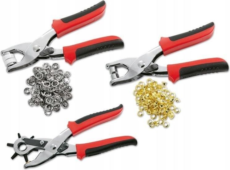 Zestaw kaletniczy do nitowania My Project 128 elementów Zestaw szczypiec do wykonywania otworów w filcu, skórze, tekstyliach oraz tekturze. Do różnych materiałów takich jak tektura, filc, skóra lub tkanina, Łatwe w użyciu, nie wymagają użycia dużej siły, Szczypce z hartowanej stali nierdzewnej. Zawartość zestawu: 1x szczypce do dziurkowania ok 220 mm 1x szczypce do nitowania oczek ok 150 mm 1x szczypce do nitowania zatrzasków ok 150 mm 100x oczka 25x zatrzaski