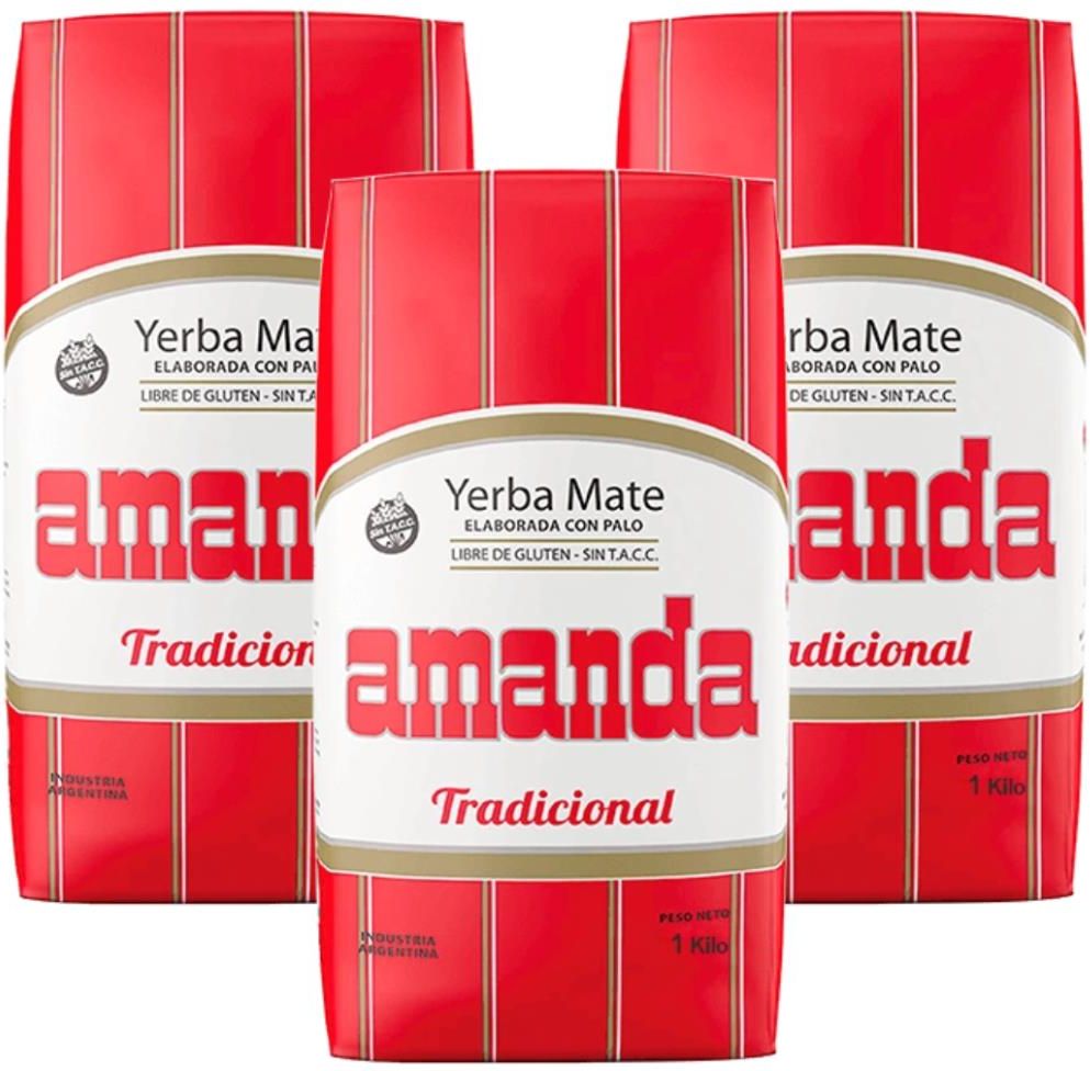 ZESTAW 3x Yerba Mate Amanda Elaborada Con Palo Tradicional 1kg 1000g Klasyczna argentyńska mate marki Amanda. Sztandarowa, najbardziej popularna yerba mate marki Amanda. Klasyka w najczystszej postaci. Produkowana od dziesięcioleci w niezmienionej formule.