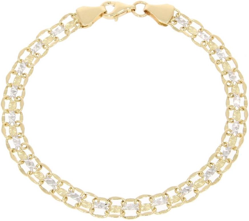 Złota bransoletka wykonana z połączenia białego i żółtego złota próby 585 (14 k) Stylowa bransoletka o ozdobnym splocie, która łączy elegancję z nowoczesnym designem. Parametry bransoletki: Długość: ok. 18 cm Szerokość: ok. 5,6 mm Waga: ok. 4,34 g Wagi i wymiary podane wyżej występują w przedziałach ze względu na różnice partii produkcyjnych. Wszystkie nasze produkty wykonane są z najwyżej jakości złota próby 585 ( 14k ) Potwierdzeniem jest metka oraz nabity imiennik lub cecha probiercza (cecha dla produktów powyżej 1 g zgodnie z ustawą o prawie probierczym).