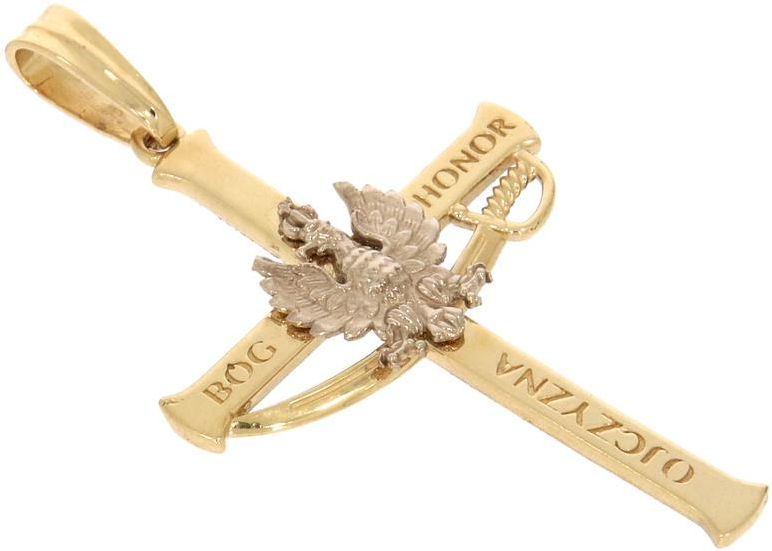 Złoty krzyż wykonany ze złota próby 585 (14 k) Zawieszka krzyżyk z połączenia żółtego i białego złota. Doskonale sprawdzi się na prezent dla patrioty. Wysokość z zawieszka: ok. 54 mm Wysokość bez zawieszki: ok. 45 mm Szerokość: ok. 30 mm Waga: ok. 5,8-5,9 g Wagi i wymiary podane wyżej mogą się nieznacznie różnić w zależności od partii produkcyjnej. Wszystkie nasze produkty wykonane są z najwyżej jakości złota próby 585 (14k). Potwierdzeniem jest metka oraz nabity imiennik lub cecha probiercza (cecha dla produktów powyżej 1 g zgodnie z ustawą o prawie probierczym). Każdy produkt zakupiony u nas opatrzony jest metką jubilerską wysokiej jakości. Możesz dokupić opakowanie ozdobne, a nawet pudełko z grawerem.