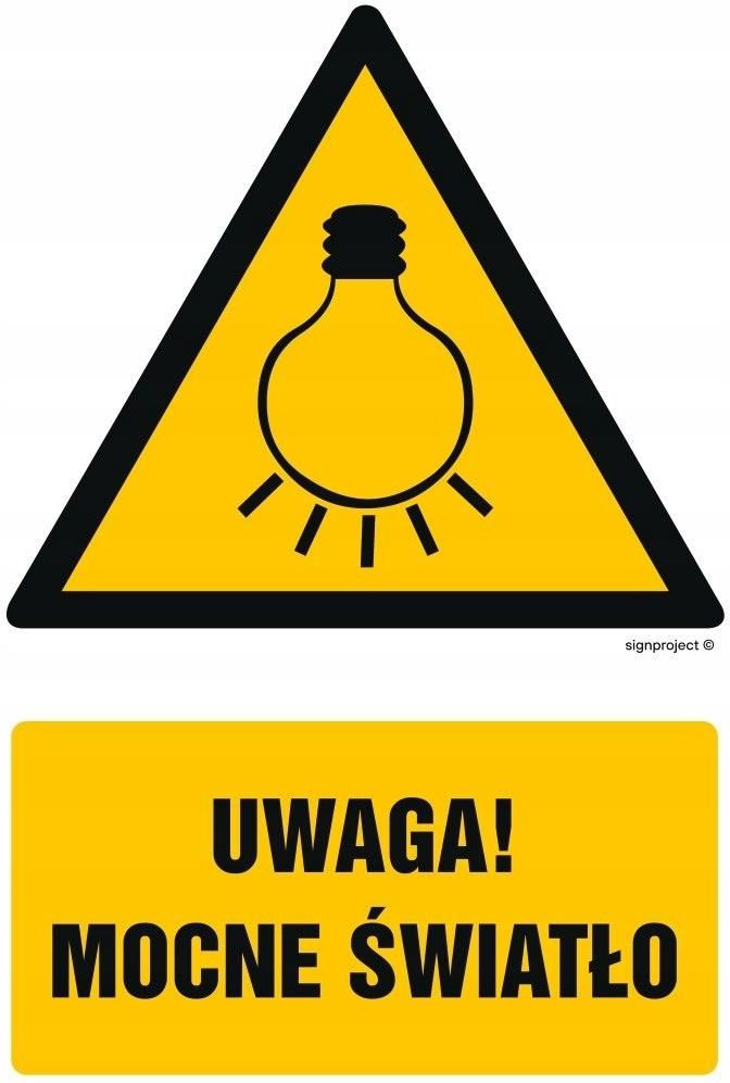 GF057 Znak „uwaga! mocne światło” jest znakiem ostrzegawczym, na co wskazuje zarówno kolorystyka piktogramu, jak i umieszczony na znaku napis. jest w trójkątnym kształcie z czarnym obramowaniem i piktogramem przedstawiającym świecącą żarówkę. napis „uwaga! mocne światło” również jest w czarnym kolorze. znak informuje o występowaniu światła o dużym natężeniu i intensywności. dla niektórych może być to zjawisko niebezpieczne, skutkujące uszkodzeniem narządu wzroku. ponadto mocne światło może w niektórych przypadkach uniemożliwiać prawidłowe widzenie. znak „uwaga! mocne światło” występuje w następujących rozmiarach: 10 x 15 cm. 15 x 22,5 cm. 20 x 30 cm. 25 x 37,5 cm. 30 x 45 cm. 35 x 52,5 cm. 5 x 7,5 cm. 50 x 75 cm. 70 x 105 cm Wykonujemy go na kilku podłożach do wyboru:. Folia samoprzylepna z wariantem fotoluminescencyjnym. Folia podłogowa z wariantem fotoluminescencyjnym. Płyta sztywna 1 mm z wariantem fotoluminescencyjnym. Płyta TD fotoluminescencyjnaPN - Płyta PVC 1mm twarda. Dostępne podłoża: pn - płyta pvc 1mm twarda fs - folia samoprzylepna foto. kn - folia podłogowa zwykła ks - folia podłogowa foto ps - płyta foto 1mm fn - folia samoprzylepna ts - płyta td foto Marka: SIGNPROJECT