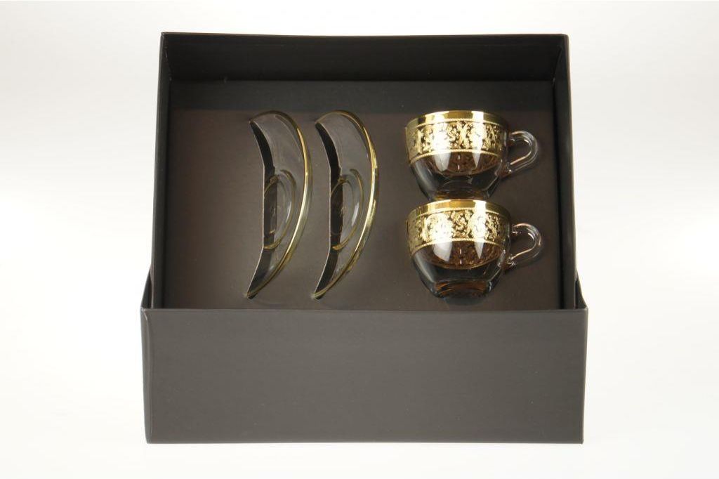 Dekoracja wykonana w naszym zakładzie w Opolu metodą trawienia w szkle. Malowane ręcznie 24 karatowym złotem . Filiżanka wykonana jest ze szkła hartowanego, które jest 2-3 razy bardziej odporne na uszkodzenia niż porcelitowe czy porcelanowe produkty o podobnej grubości. Komplet składa się z: 2 x Filiżanka 2 x Spodek