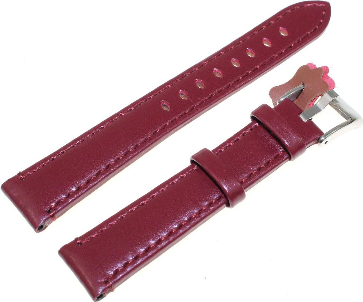 Bordowy skórzany zwężany delikatnie błyszczący gładki przeszywany pasek do zegarka hiszpańskiej firmy DILOY. Szerokość 18 mm. Przeszycie w kolorze paska. Pasuje do wszystkich zegarków ze standardowym mocowaniem o szerokości 18 mm. Teleskopy gratis