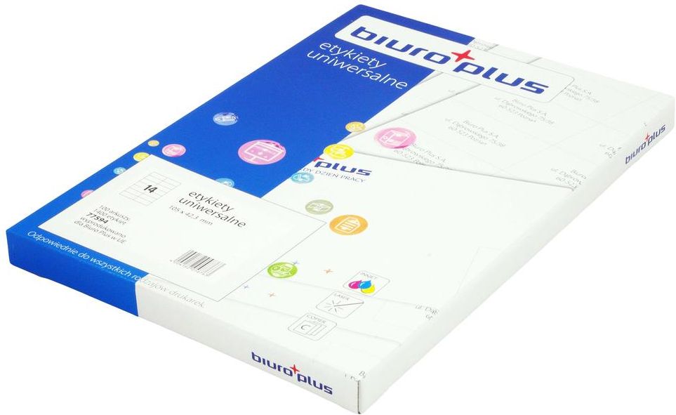 Etykieta uniwersalna Biuro Plus w formacie A4 o wymiarze 105mm x 42,4mm współpracuje ze wszystkimi rodzajami drukarek atramentowych, igłowych i z większością drukarek laserowych. Etykieta dostępna jest w wersji tzw. Quatro Clean Technology to jest z krawędziami bezpieczeństwa, które służą do zapobiegania odkładaniu się kleju na mechanizmie drukarki. W opakowaniu znajduje się 100 arkuszy po 14 etykiet na arkuszu. W ofercie dostępne są etykiety w różnych wymiarach.