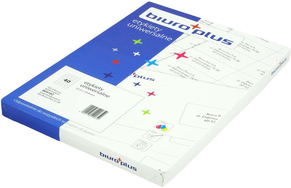 Etykieta uniwersalna Biuro Plus w formacie A4 o wymiarze 52,5mm x 29,6mm współpracuje ze wszystkimi rodzajami drukarek atramentowych, igłowych i z większością drukarek laserowych. Etykieta dostępna jest w wersji tzw. Quatro Clean Technology to jest z krawędziami bezpieczeństwa, które służą do zapobiegania odkładaniu się kleju na mechanizmie drukarki. W opakowaniu znajduje się 100 arkuszy po 40 etykiet na arkuszu. W ofercie dostępne są etykiety w różnych wymiarach.
