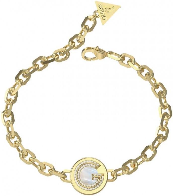 Damska błyszcząca platerowana pozłacana stalowa bransoletka Guess z kolekcji G Crystal. Złocenie w kolorze żółtego złota. Zdobiona cyrkoniami zawieszka w kształcie koła. Regulowana długość.