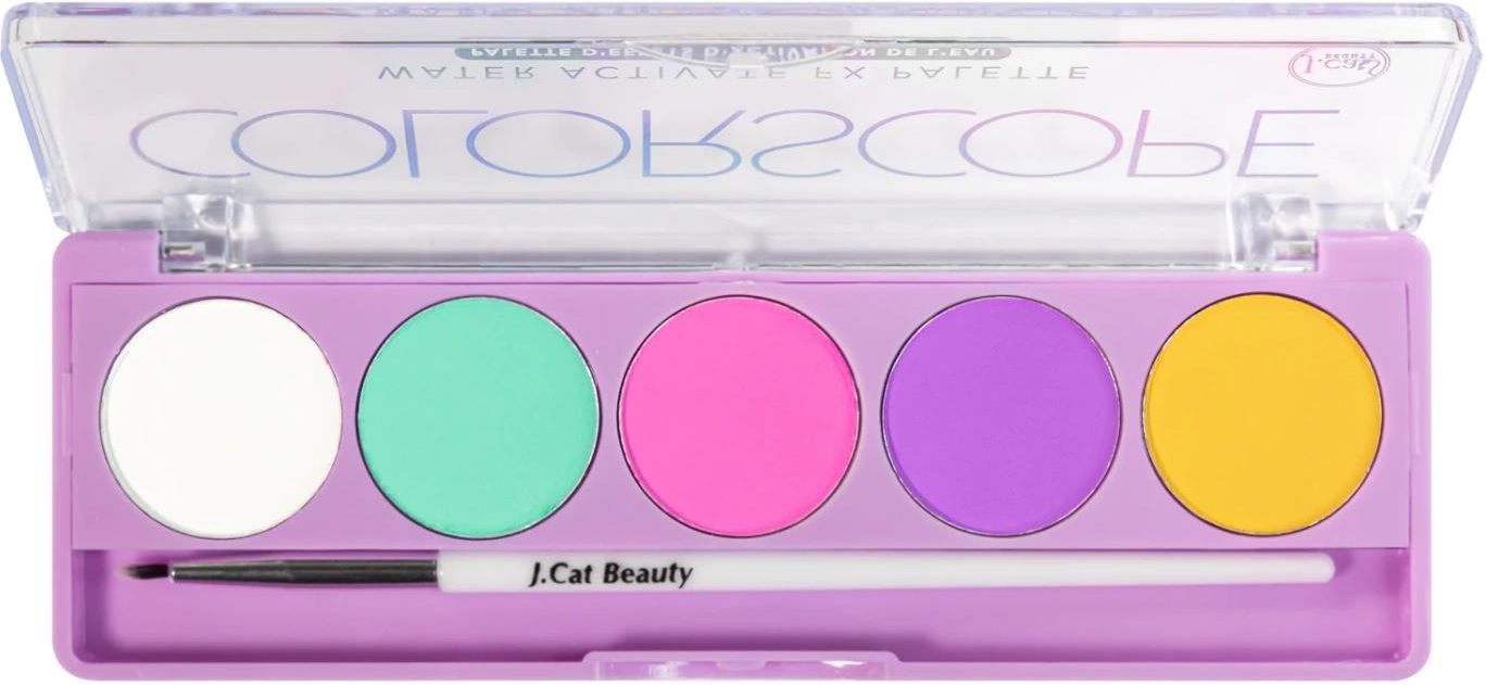 J.Cat Beauty Colorscope Paleta Eyelinerów Aktywowanych Wodą 103 Bright Pastel Colorscope to paleta dla tych, którzy uwielbiają bawić się makijażem i eksperymentować z kolorem. Dzięki 5 odcieniom pełnym zabawy, ta paleta pozwala Ci na tworzenie niepowtarzalnych kresek, które doskonale oddają Twój styl i osobowość. Od neonowych, wyrazistych barw, które ożywią Twój look, po bardziej stonowane odcienie daje Ci pełną swobodę w wyborze stylizacji. Produkt jest odporny na rozmazywanie i zapewnia efekt świecenia w ciemności. Paleta dostępna jest w trzech wersjach kolorystycznych. Jak używać palety? Aktywuj kolor: Dodaj kilka kropel wody do wybranego odcienia. Mieszaj: Użyj pędzelka, aby stworzyć idealną konsystencję. Wersja: 103 Bright Pastel