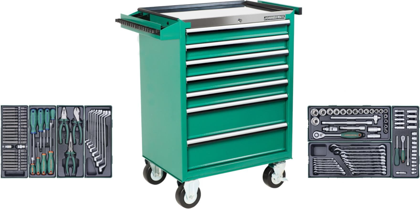 Zawartość zestawu: C-7DS2 Wózek narzędziowy 7-szufladowy z blatem roboczym ze stali nierdzewnej z uchwytem D71PP08SP Zestaw 8szt. wkrętaków serii D71 we wkładce plastikowej - D71P (4szt.) - wkrętaki krzyżakowe: PH1x80, PH2x38, PH2x100, PH3x150 - D71S (4szt.) - wkrętaki płaskie: 4x80, 5.5x125, 6.5x38, 6.5x150 P08103SP Zestaw 3szt. szczypiec we wkładce plastikowej - P0817 Kombinerki 7" - P0917 Szczypce do cięcia boczne 7" - P1118 Szczypce proste 8" S04H2125SP Zestaw 25szt. narzędzi 1/4" we wkładce plastikowej - S04H2 (11szt.) - klucze nasadowe 1/4#8221; - 4, 5, 5.5, 6, 7, 8, 9, 10, 11, 12, 13mm - S04HD2 (9szt.) - klucze nasadowe długie 1/4#8221; - 5, 6, 7, 8, 9, 10, 11, 12, 13mm - R3702 (1szt.) - grzechotka1/4#8221; - S24H2 (2szt.) - przedłużki 1/4#8221; L=2#8221;, L=6#8221; - S26H2150 (1szt.) - pokrętło wkrętakowe 1/4#8221; S04H4125SP Zestaw 25szt. narzędzi z nasadkami 6-kątnymi 1/2" we wkładce plastikowej - S04H41 (18szt.) - nasadki 6-kt. 1/2": 1/2#8221;: 10, 11, 12, 13, 14, 15, 16, 17, 18, 19, 20, 21, 22, 23, 24, 27, 30, 32mm - S17H4 (2szt.) - nasadki do świec zapłonowych 1/2" 16 i 21mm - S24H4 (2szt.) - przedłużki 1/2": L=125mm, L=250mm - S23H41250 (1szt.) - pokrętło z przetyczką 1/2#8221; - S15H472 (1szt.) - przegub 1/2" - R3704 (1szt.) - grzechotka 1/2" 48 zębów S29H4140SP Zestaw 40szt. bitów 10mm we wkładce plastikowej - D130H (7szt.) - bity 10mm ampulowe L=30mm: 4, 5, 6, 7, 8, 10, 12mm - D175H (7szt.) - bity 10mm ampulowe L=75mm: 4, 5, 6, 7, 8, 10, 12mm - D130T (7szt.) - bity 10mm TORX L=30mm: T20, T25, T30, T40, T45, T50, T55 - D175T (7szt.) - bity 10mm TORX L=75mm: T20, T25, T30, T40, T45, T50, T55 - D10M30M (5szt.) - bity 10mm SPLINE L=30mm: M5, M6, M8, M10, M12 - D10M75M (5szt.) - bity 10mm SPLINE L=75mm: M5, M6, M8, M10, M12 - S44H3210 (1szt.) - adapter 1/2" x 6-kt. 10mm - S44H4210 (1szt.) - adapter 3/8" x 6-kt. 10mm W23108SP Zestaw 8szt. kluczy oczkowo-giętych 6-22mm we wkładce plastikowej - W23 (8szt.) - klucze oczkowo-gięte w rozmiarach: 6x7, 8x9, 10x11, 12x13, 14x15, 16x17, 18x19, 20x22mm W26116SP Zestaw 16szt. kluczy płasko-oczkowych 6-24mm we wkładce plastikowej - W26 (16szt.) - klucze płasko-oczkowe w rozmiarach: 6, 7, 8, 9, 10, 11, 12, 13, 14, 15, 16, 17, 18, 19, 22, 24mm