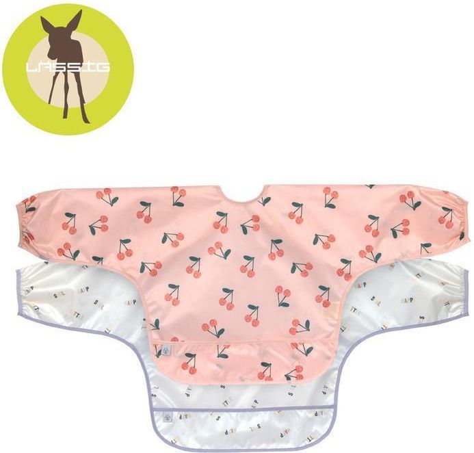 Zestaw dwóch praktycznych, łatwo zmywalnych śliniaków niemieckiej marki LASSIG. Są duże, wykonane z wodoodpornego tworzywa – jeden różowy z motywem uśmiechniętych wisienek (multiprint), drugi biały z kolorowym napisem HAPPY i pastelowym obszyciem. Mają długie rękawy, wiązanie na tasiemki, a na dole …