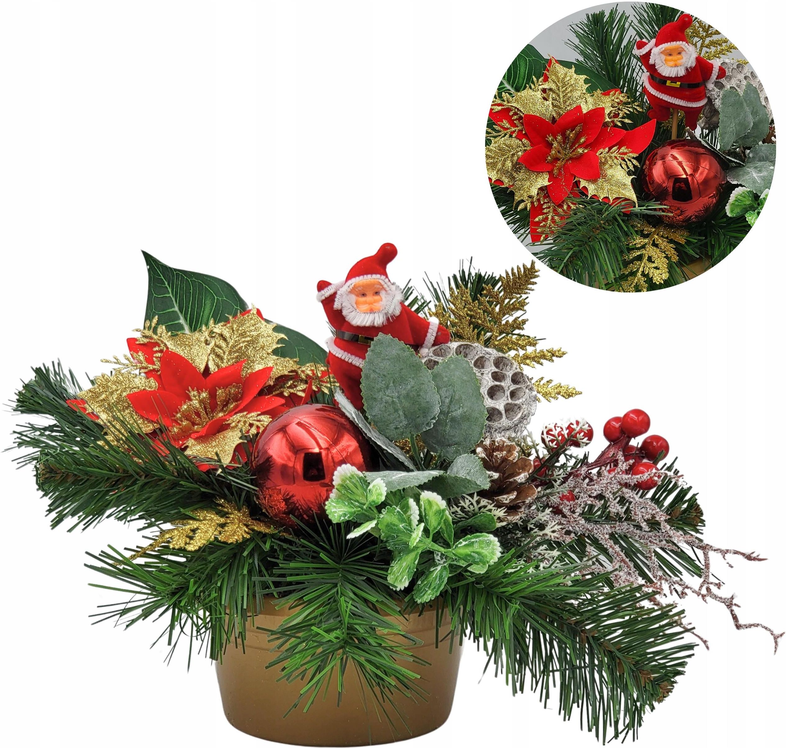 Stroik Boże Narodzenie Wianek Świąteczny na Stół Czerwono-Złoty z Mikołajem Stroik Bożonarodzeniowy Z Mikołajem i Gwiazdą Betlejemską Cechy, które mają dla Ciebie znaczenie wysokość w najwyższym punkcie: 24 cm szerokość w najszerszym punkcie: 32 cm obciążona doniczka Kompozycja składa się z …
