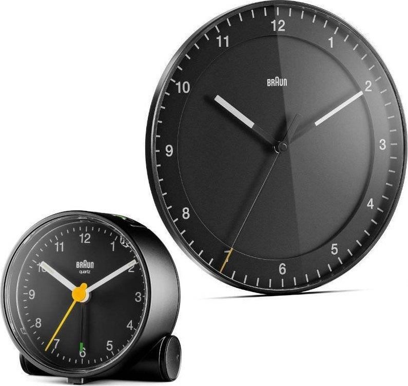 Zestaw składający się z zegara na ścianę z cichym mechanizmem BC17B i małego czytelnego okrągłego podświetlanego czarnego budzika kwarcowego BC01B firmy Braun.