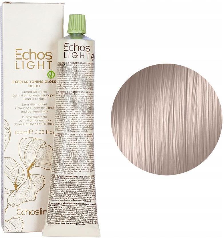 Echosline Echoslight Beige Toner 100 ml ECHOS LIGHT TONER został opracowany, aby nadać maksymalny blask. Charakteryzuje się innowacyjną formułą NO LIFT i AMMONIA-FREE, usuwa wszelkie żółte pozostałości, zapewniając doskonałą definicję pożądanego odcienia. Zawiera olejek tsubaki i olejek arganowy, które chronią i pielęgnują strukturę włosa, a także keratynę roślinną i aminokwasy. Innowacyjna, pozbawiona amoniaku i szybko działająca formuła NO LIFT sprawia, że podczas koloryzacji nie dochodzi do niepożądanego rozjaśnienia naturalnych włosów. Nie koloryzuje włosów siwych i białych. Nie zwiększa poziomu rozjaśnienia włosów naturalnych. Sposób użycia: 1. Wymieszać 1 część Echos Light Toner z 2 częściami utleniacza 1,05%, 2,1% lub 3% w proporcji 1:2 do uzyskania jednorodnej kremowej konsystencji. 2. Nałożyć i równomiernie rozprowadzić mieszankę na uprzednio rozjaśnionych, umytych i osuszonych ręcznikiem włosach. 3. Wizualnie kontrolować proces, czas ekspozycji wynosi 3-15 minut. 4. Po upływie czasu ekspozycji dokładnie spłukać wodą. 5. Przejść do kolejnego etapu pielęgnacji, w zależności od potrzeb lub struktury/typu włosów. Pojemność: 100 ml