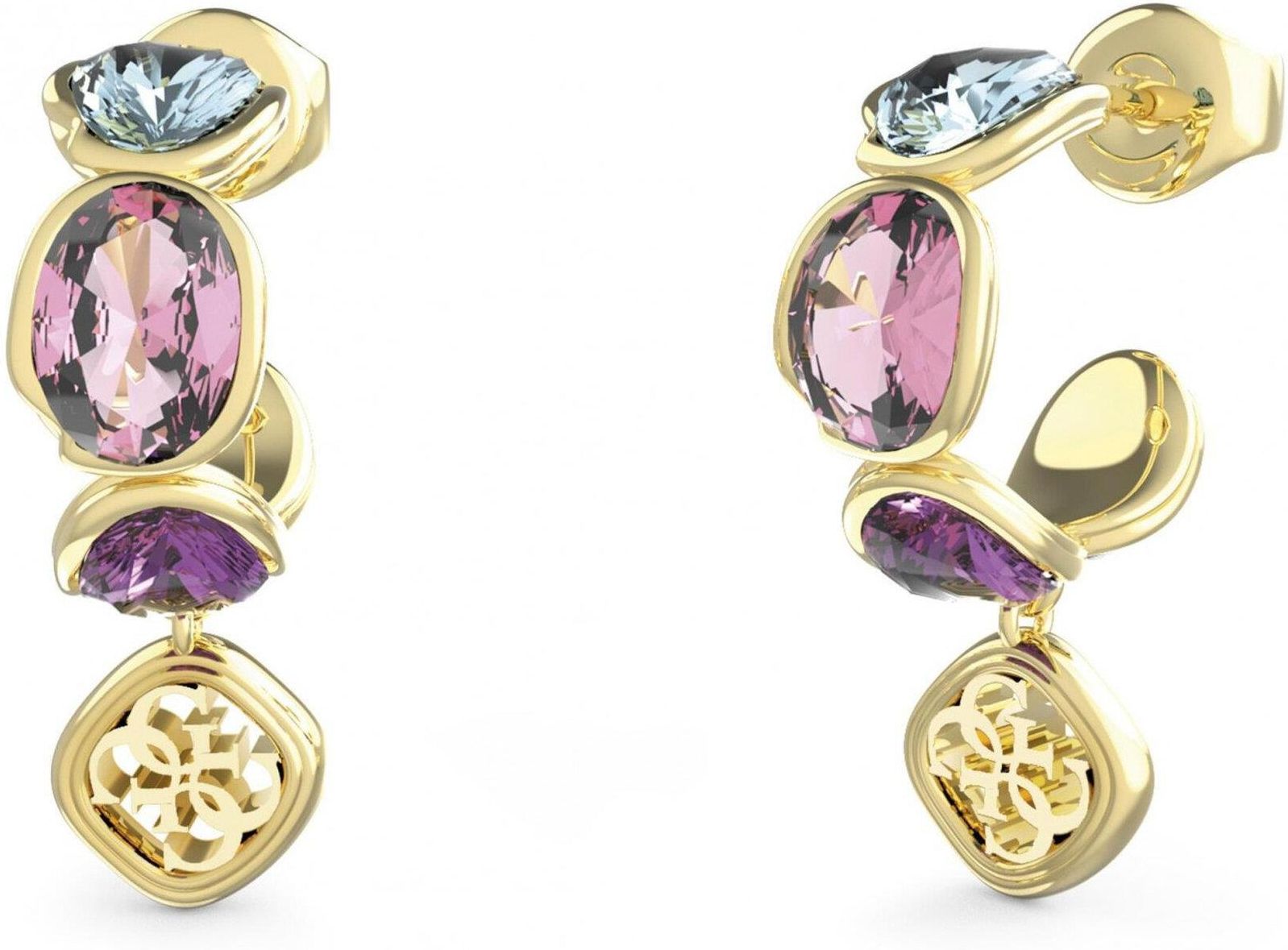 Damskie eleganckie platerowane pozłacane wysadzane kolorowymi kryształkami stalowe kolczyki Guess. Kolekcja Mamounia. Złocenie w kolorze żółtego złota. Zapięcie na sztyft