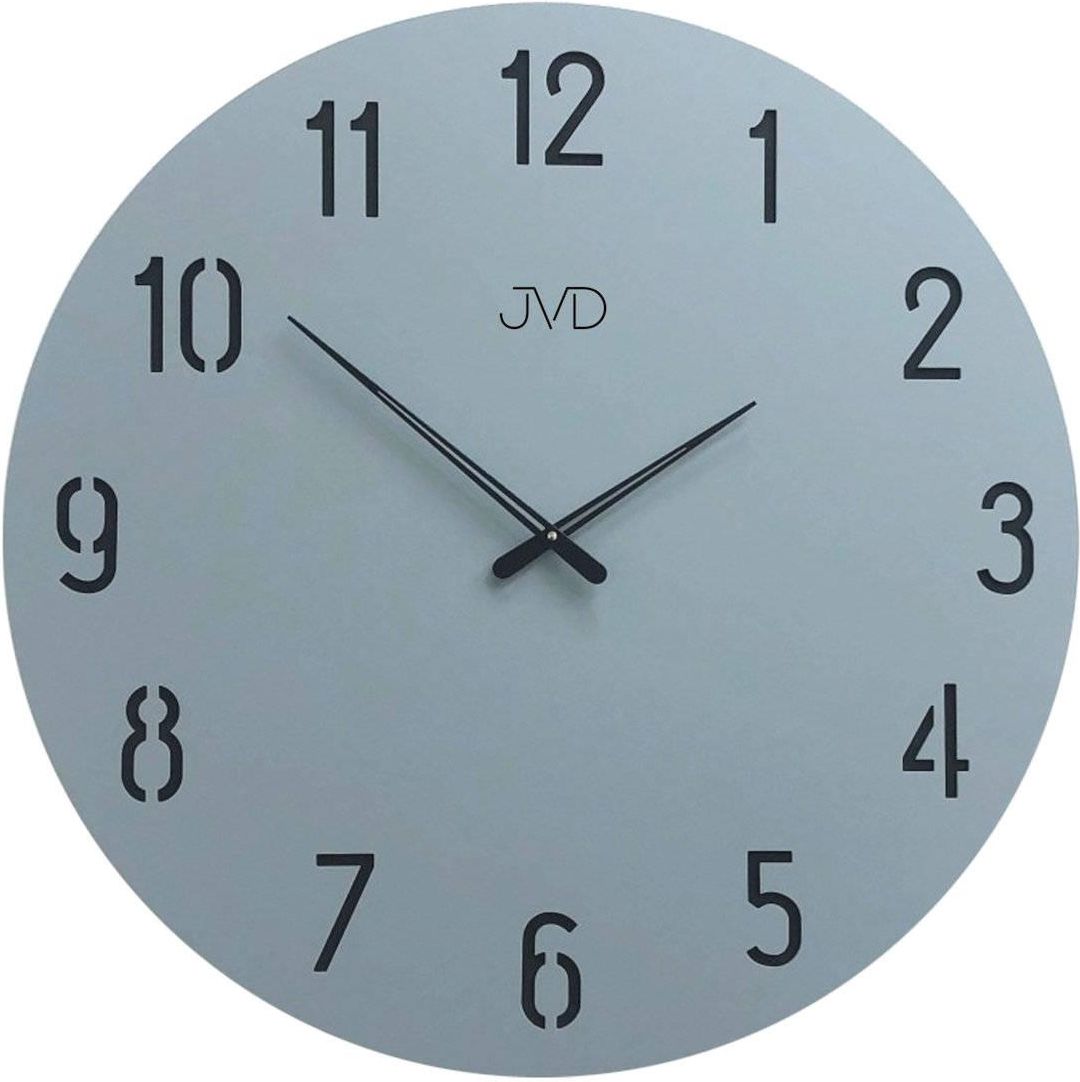 Duży drewniany (MDF) okrągły elegancki nowoczesny szary zegar ścienny JVD HC43 do salonu, biura. Cichy mechanizm kwarcowy. Średnica 70 cm. Czytelne cyfry arabskie wycinane w obudowie zegara
