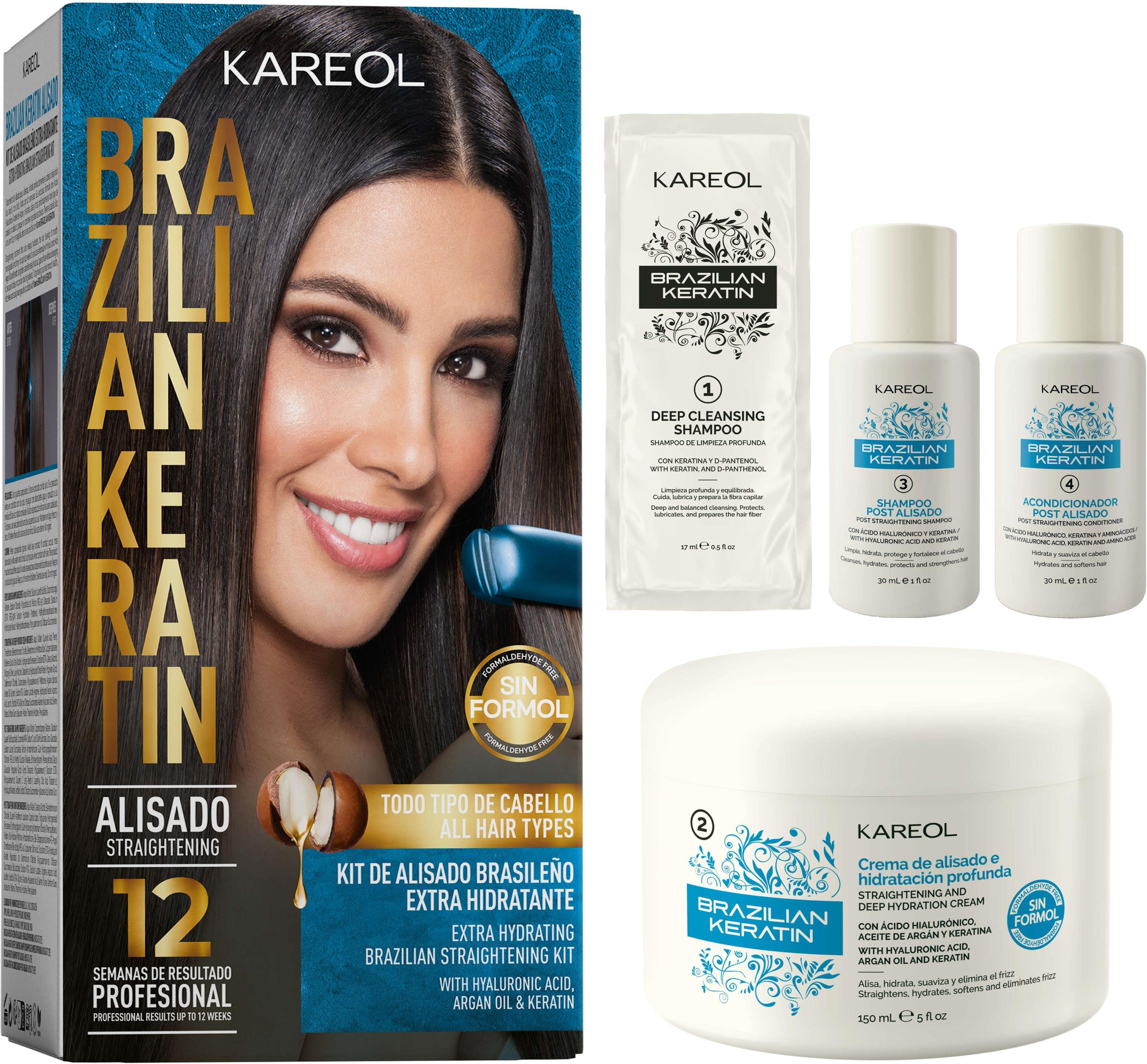 Zestaw Do Prostowania Włosów Keratynowe Prostowanie -nawilżające Karol Brazylijski Zestaw do Prostowania włosów to rewolucyjny produkt do użytku domowego, który umożliwia uzyskanie efektu salonowego prostowania włosów w komforcie własnego domu. Karol Brazilian Keratin Extra Hydrating Kit to doskonały wybór dla każdego, kto marzy o gładkich, lśniących włosach bez wychodzenia z domu. Sprawdź, jak łatwo możesz osiągnąć salonowe efekty w zaciszu własnego domu! Kluczowe Cechy Produktu Innowacyjna Formuła: Wykorzystuje ekskluzywną mieszankę składników, takich jak kwas hialuronowy, olej arganowy i keratyna, co zapewnia intensywne nawilżenie i odżywienie włosów. Łatwość Stosowania: Zestaw został zaprojektowany z myślą o prostocie aplikacji, umożliwiając łatwe i szybkie prostowanie włosów w domu. Długotrwałe Efekty: Efekt prostych, lśniących i zdrowo wyglądających włosów utrzymuje się aż do 12 tygodni. Redukcja Puszenia: Zestaw pomaga zmniejszyć niechciane frizz i statyczne elektryzowanie się włosów. Bezpieczeństwo: Produkt nie zawiera szkodliwego formaldehydu, co gwarantuje bezpieczeństwo stosowania. Wzmacnia i Naprawia: Formuła wzmacnia włosy, zwiększając ich elastyczność i siłę, a także intensywnie je odżywia, zapewniając naturalny połysk i miękkość. Uniwersalność: Zestaw jest odpowiedni dla wszystkich typów włosów, zapewniając doskonałe rezultaty niezależnie od ich struktury. Zestaw Zawiera Krem do prostowania 150 ml Szampon Oczyszczający 17ml Szampon po prostowaniu 30ml Odżywkę po prostowaniu 30ml Pędzelek do nakładania Ochronne Rękawiczki Szczegółową instrukcję użycia UWAGA Ważne jest, aby krok po kroku stosować się do instrukcji, nie pomijając żadnych etapów. Produkt może rozjaśnić kolor farbowanych włosów. Jeśli pożądane jest ponowne farbowanie, może być przeprowadzone od razu po zabiegu prostowania. Najczęściej zadawane pytania Q: Jak długo efekty prostowania się utrzymują? A: Efekty mogą utrzymać się do 12 tygodni, zależnie od typu włosów i stosowanej pielęgnacji. By podtrzymać efekt prostych włosów zalecamy używanie zestawu po prostowaniu włosów Kaerol bez soli oraz siarczanów. Q: Czy ten zestaw jest odpowiedni dla wszystkich typów włosów? A: Tak, zestaw jest przeznaczony do różnych typów włosów, ale zawsze zaleca się wykonanie testu na małej sekcji włosów przed pełnym zastosowaniem. Q: Czy produkt zawiera sulfaty lub parabeny? A: Nie, zestaw do prostowania włosów Kareol jest wolny od sulfatów i parabenów. Q: Czy mogę używać zestawu na farbowanych włosach? A: Zestaw jest bezpieczny dla farbowanych włosów, jednak produkt może rozjaśnić kolor farbowanych włosów. Zalecamy konsultację z fryzjerem lub wykonanie testu na niewielkiej części włosów. Q: Jakie środki ostrożności powinienem podjąć podczas używania produktu? A: Unikaj kontaktu z oczami i nie połykaj produktu. W przypadku kontaktu z oczami, natychmiast przemyj je dużą ilością wody. Przechowuj produkt w miejscu niedostępnym dla dzieci. Aby przedłużyć efekt prostowania, używaj produktów pielęgnacyjnych Kativa, które są wolne od soli i siarczanów.