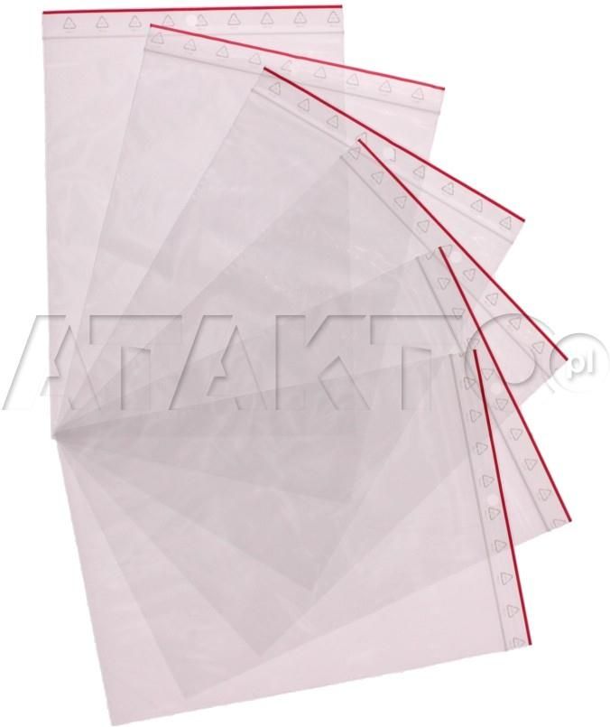 Informacje o produkcie: - Wykonane z folii LDPE. - Posiadają specjalne zamknięcie strunowe (tzw. Zippery) w kolorze czerwonym oraz dziurkę do zawieszania na stojaku. Rozmiar: 1 woreczek:10 x 15 cm, grubość 40 mikronów.