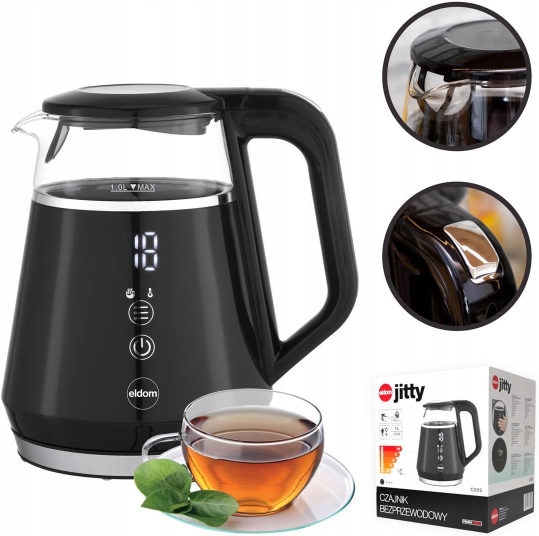 Czajnik bezprzewodowy z regulacją temperatury Eldom C505 jitty Przedstawiamy nowoczesny czajnik elektryczny Eldom, który z pewnością stanie się ozdobą każdej kuchni. Dzięki pojemności 1 litra i szklanemu korpusowi, ten czajnik łączy styl z wygodą użytkowania. Wyposażony w cyfrowy wyświetlacz LED, pozwala na dokładne monitorowanie temperatury wody, co sprawia, że jest idealny do przygotowywania herbat, kaw, czy naparów o precyzyjnie dobranej temperaturze. Odkryj wygodę i nowoczesność, jaką oferuje czajnik elektryczny Eldom C505 jitty. Zaprojektowany z dbałością o każdy szczegół, ten model nie tylko przyciąga wzrok swoim stylowym wyglądem, ale również wyróżnia się wyjątkową funkcjonalnością. Dzięki pojemności 1 litra i szerokiemu zakresowi ustawień temperatury, Eldom sprosta wymaganiom każdego miłośnika herbaty i kawy. Czajnik Eldom to połączenie innowacyjnych rozwiązań i eleganckiego designu, które sprawią, że codzienne przygotowywanie napojów stanie się przyjemnością. Postaw na nowoczesność i styl w swojej kuchni! Najważniejsze cechy czajnika Eldom C505 JITTY ✔️Precyzyjna kontrola temperatury – wybierz idealną temperaturę wody, idealną do parzenia różnych napojów, od herbaty po kawę. ✔️Pojemność 1 litr – wystarczająca na przygotowanie kilku filiżanek napoju, idealna zarówno dla singli, jak i dla rodzin. ✔️Wygodna obsługa jednym przyciskiem – intuicyjny panel dotykowy pozwala na szybkie i bezproblemowe użytkowanie. ✔️Wysokiej jakości materiały – trwały szklany dzbanek oraz solidna konstrukcja zapewniają długą żywotność urządzenia. ✔️Automatyczne wyłączanie – dla Twojego bezpieczeństwa i oszczędności energii, czajnik automatycznie wyłączy się po zagotowaniu wody. Czajnik Eldom C505 jitty Pojemność: 1 litr Moc: 900-1100W Materiał: szkło + tworzywo sztuczne Wyświetlacz: LED PANEL DOTYKOWY Funkcje: regulacja temperatury, automatyczne wyłączanie Czajnik elektryczny Eldom – elegancja i funkcjonalność w jednym! 5 zapisanych programów temperatury ⭐️ 40°C – Idealna do wody dla dzieci oraz napojów o niskiej temperaturze: Ta opcja jest idealna, gdy chcesz przygotować wodę dla dziecka lub delikatny napar z ziół, który nie wymaga wysokiej temperatury. Świetnie sprawdza się także do przygotowywania mieszanki miodu z wodą, by zachować jego cenne właściwości. ⭐️ 70°C – Perfekcyjna do herbat zielonych i białych: Herbaty zielone oraz białe wymagają łagodnego podgrzania, aby uniknąć gorzkiego smaku i zachować ich subtelny aromat. Dzięki ustawieniu na 70°C masz pewność, że przygotowana herbata będzie miała idealny smak i aromat. ⭐️ 80°C – Odpowiednia do kawy przelewowej i niektórych herbat ziołowych: Jeśli lubisz kawę przelewową lub napary z ziół, opcja 80°C pozwoli Ci na uzyskanie pełni smaku i aromatu bez ryzyka przeparzenia delikatnych składników. ⭐️ 90°C – Doskonała do herbat czarnych i czerwonych: Czarna i czerwona herbata najlepiej rozwijają swój smak i aromat w temperaturze 90°C. To ustawienie umożliwia idealne przygotowanie intensywniejszych napojów, bez ryzyka zbyt mocnego naparu. ⭐️ 100°C – Pełne zagotowanie do napojów wymagających wrzątku: To ustawienie gwarantuje pełne zagotowanie wody, idealne do przygotowania herbat ziołowych, gorącej czekolady czy kubków instant. Wrzątek to także świetne rozwiązanie do szybkiej dezynfekcji naczyń i sztućców. Funkcja podtrzymania temperatury Dzięki tej funkcji woda w czajniku pozostaje ciepła przez dłuższy czas, co jest niezwykle przydatne, gdy potrzebujesz dolać gorącej wody po chwili od zagotowania. Wyposażona w nowoczesny system grzewczy, płyta grzejna szybko podgrzewa wodę do wybranej temperatury, zapewniając efektywność i oszczędność energii. Dzięki tej funkcji nie trzeba ponownie gotować wody, jeśli chcemy zrobić kolejną herbatę lub kawę w krótkim odstępie czasu. Woda pozostaje gotowa do użycia. Funkcja ta zużywa mniej energii niż ponowne gotowanie wody, co jest bardziej ekonomiczne i przyjazne dla środowiska. Izolowana obudowa – szkło + tworzywo Elegancka, przezroczysta konstrukcja szklanego korpusu jest dodatkowo wzmocniona tworzywem sztucznym, które zapewnia bezpieczeństwo i izolację cieplną. Połączenie tych materiałów nadaje czajnikowi niepowtarzalny styl i funkcjonalność. Prosty w obsłudze dotykowy panel pozwala na łatwy wybór temperatury oraz innych funkcji. Każde ustawienie jest czytelne i wygodne, co ułatwia codzienne korzystanie z urządzenia. Panel dotykowy nadaje nowoczesny, estetyczny wygląd, który pasuje do nowoczesnych kuchni i sprawia, że urządzenie wygląda stylowo. Gładka powierzchnia panelu dotykowego jest łatwa do wyczyszczenia – wystarczy przetrzeć ją ściereczką, co pozwala na utrzymanie urządzenia w higienicznej czystości. Czajnik BPA-free to wybór świadomych konsumentów dbających o zdrowie i środowisko. BPA (bisfenol A) jest związkiem chemicznym, który często stosuje się w produkcji tworzyw sztucznych, ale może on migrować do żywności lub napojów, zwłaszcza pod wpływem wysokiej temperatury. Czajnik oznaczony jako BPA-free ma szereg zalet: ➡️ Bezpieczeństwo dla zdrowia: Brak BPA oznacza, że podczas gotowania wody nie wydzielają się szkodliwe substancje chemiczne, co zmniejsza ryzyko wystąpienia zaburzeń hormonalnych i innych problemów zdrowotnych. ➡️Lepszy smak wody: Tworzywa wolne od BPA często nie wpływają na smak wody, co jest szczególnie istotne dla osób, które zwracają uwagę na jakość napojów. ➡️Ekologiczność: Producenci wybierający materiały bez BPA zwykle kładą większy nacisk na stosowanie bezpieczniejszych i bardziej przyjaznych środowisku tworzyw. Wskaźnik poziomu wody Praktyczny wskaźnik poziomu wody ułatwia kontrolę nad ilością wody w czajniku, dzięki czemu wiesz, ile płynu masz d