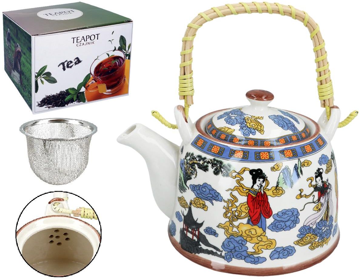 Wykonany z dobrej jakości ceramiki/porcelitu czajniczek z metalowym zaparzaczem i rączką częściowo wykonaną z bambusu.Czajniczek wchodzi w skład kolekcji Traditional Excellence stworzonej przez chiński koncern Santai charakteryzującej się typowo dalekowschodnimi, orientalnymi motywami.Pojemność czajniczka = około 800ml Ważne: ze względu na ręczną technologię produkcji czajniczków mogą występować pewne niedoskonałości w szlifie (np.: chropowatość powierzchni) nie mające jednak wpływu na cechy użytkowe. Aerografowanie, zdobienie naklejkami i wypalanie w piecu w różnych partiach powodują drobne różnice w kolorze i kształcie – drobne niedoskonałości, które są znakiem rozpoznawczym tego rzemiosła, a więc wynikłe z tych powodów różnice są naturalne powstałe z powodu zastosowanej technologii.