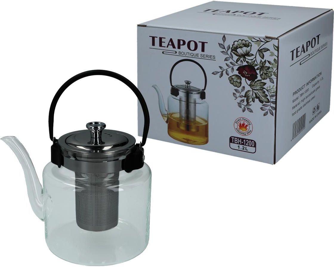 Szklany czajnik z zaparzaczem. Świetny do codziennego użytku, ale również dobrze się prezentuje podając go gościom na stół. Kolekcja: czajniki szklane Rozmiar: 1200ml Opakowanie: biały karton Liczba sztuk w opakowaniu: 24 Podgrupa: czajniki Tematyka: zielarstwo, zdrowie EAN: 5905450823658