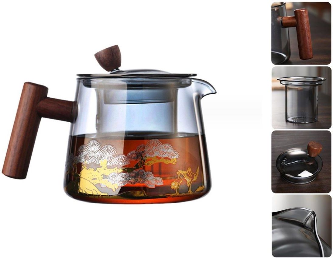 Czajnik SZKLANY z drewnianą rączką DUŻY do herbaty PREZENT - 750 ml Czajnik szklany Zasługujesz na absolutnie wyjątkowy prezent w postaci ekskluzywnego kompletu, który sprawi, że parzenie herbaty stanie się prawdziwą ceremonią! Piękny i funkcjonalny zestaw składający się z czajnika, szklanego zaparzacza i pokrywki. Czajnik został wykonany ze szkła odpornego na wysokie temperatury. Szkło oraz drewniane elementy sprawiają, że komplet prezentuje się niezwykle elegancko i klasycznie. Koniec z uciążliwymi fusami. Jedyną rzeczą, która może odebrać nam przyjemność z picia herbaty są pływające luźno fusy, których wybranie kończy się zwykle szybkim wystudzeniem naparu. Dodatkowo należy pamiętać, że w przypadku niektórych herbat czas parzenia nie powinien przekroczyć 3 minut, dlatego powolne wyławianie liści może spowodować utratę ich cennych właściwości i aksamitnego smaku. Dzięki wyjmowanemu, zaparzaczowi przyrządzanie ulubionych napojów stanie się bajecznie proste! To idealna propozycja na prezent! Paczka ulubionej herbaty i szklany czajnik z zaparzaczem stanowić będą idealny prezentowy zestaw, którym zachwyci się każdy. Oprócz wyjątkowego wyglądu i niezwykłej praktyczności taki zestaw pokaże bliskiej osobie, że troszczysz się o jej zdrowie, gdyż herbata zaparzona we właściwy sposób posiada wiele cudownych właściwości. Szczegółowe informacje Elementy zestawu: czajnik, zaparzacz, pokrywka, pudełko. Pojemność czajnika: 750 ml Materiał: szkło, drewno