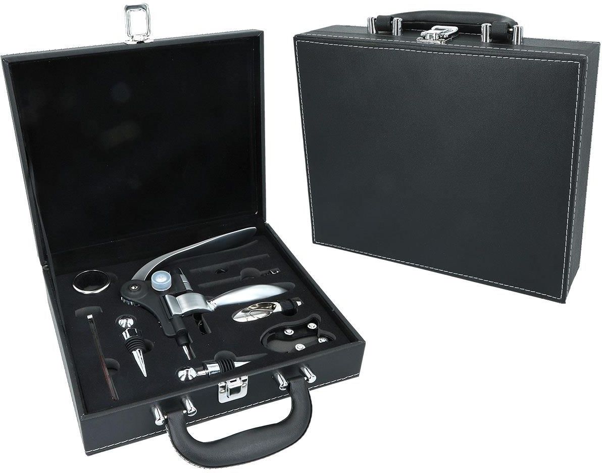 Kpl. akcesoriów do wina w walizce (7 elementów) 125-0044 Nie musisz być sommelierem, żeby otworzyć butelkę jak zawodowiec - wystarczy mieć dobry zestaw np. z korkociągiem, zatyczką i nalewakiem. Taki zestaw jest idealny na prezent - praktyczny ale luksusowy i co ważne w eleanckiej walizce. …
