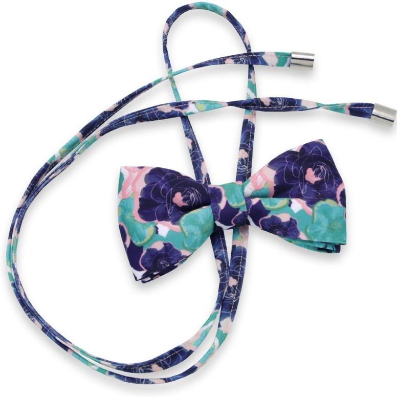 Mucha damska Willsoor Zestaw składający się z muchy gotowej opakowanej w kartonowe pudełko. Muchę swobodnie przesuwa się po paskach co sprawia, że można ją nosić na wiele sposobów: na szyi jako ozdoba spełniająca rolę naszyjnika, pod szyją jako tradycyjną muszkę, we włosach lub jako pasek. Elegancko zapakowany zestaw jest również idealnym pomysłem na prezent. - Tkanina: 100% satyna - Kolor muchy: granatowe, różowe i zielone kwiaty - Długość paska: 70cm - Wymiary: 12cm x 5,5cm - Opakowanie: kartonowe pudełko Willsoor - Producent: Willsoor