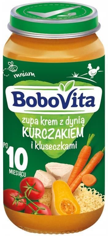 Bobovita Zupa krem z dynią kurczakiem i kluseczkami po 10 miesiącu 250g Opis produktu BoboVita zupa z dynią kurczakiem i kluseczkami to produkt spożywczy opracowany z myślą o wzbogaceniu diety dzieci po 10. miesiącu życie o nowe, apetyczne smaku. Właściwości produktu BoboVita zupa z dynią kurczakiem i kluseczkami stanowi idealny pomysł na obiad dla dzieci. Produkt w 100% z mięsa bez pozostałości antybiotyków oraz z warzyw pochodzących z kontrolowanych upraw. Składniki Warzywa70% (ziemniaki, odtworzony przecier pomidorowy 20,8%, marchewka 17%, dynia 8%), woda użyta do przygotowania, mięso z kurczaka 8%, gotowany makaron 6,5% (mąka z pszenicy durum, białka jaja w proszku), olej słonecznikowy, skrobia kukurydziana. Może zawierać soję i gorczycę. Masa netto 250 g Sposób przygotowania Przy pomocy plastikowej łyżeczki nałóż odpowiednią ilość produktu do miseczki, a następnie podgrzej w kąpieli wodnej. Po sprawdzeniu temperatury obiadku podaj dziecku, lub pozwól spróbować samodzielnego jedzenia łyżeczką. Pozostałą część przechowuj w zamkniętym słoiczku w lodówce, nie dłużej niż 48 godzin. Nie przechowuj resztek produktu, który jadło dziecko. Przestrzegaj instrukcji właściwego przygotowania. Przeciwwskazania i środki ostrożności Nie używaj, jeśli można wcisnąć środek wieczka. Opakowanie 250 g