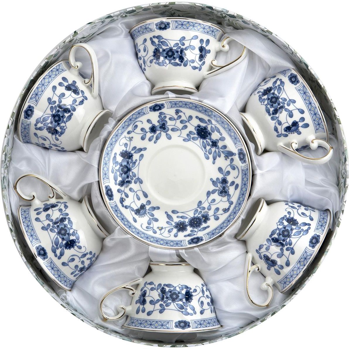 Porcelanowy zestaw filiżanek ze spodkami Moments. Kolekcja Moments wykonana jest z porcelany New Bone China renomowanej marki Veroni, charakteryzującej się elegancką i naturalną białą barwą z subtelnym połyskiem, a także wyjątkową wytrzymałością. Elegancka filiżanka z lekkimi wypukłościami została ozdobiona niebieskimi kwiatami i złotym paskiem. Spodek ze złota lamówką oraz ozdobnymi niebieskimi kwiatami nadaje finezyjnego wyglądu. Podając kawę w takiej filiżance, zachwycisz gości takim podaniem. Zestaw zawiera: 6 x Filiżanka o pojemności producenta 230 m 6 x Spodek o średnicy 15 cm Ozdobne pudełko Całość zapakowana jest w oryginalne, zdobione pudełko. Stanowi idealny pomysł na gotowy prezent zarówno dla kobiety i mężczyzny, a także podarunek dla szefa czy nauczyciela, również jako podziękowanie. Specyfikacja: Marka: Veroni Materiał: porcelana New Bone China Kolor: biały, złoty, niebieski Zmywarka: Nie Mikrofala: Nie Wymiary filiżanki: 10 × 13 × 7 cm Wymiary spodka: 15 × 2 cm