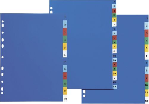 - wykonane z mocnego, elastycznego, kolorowego PP - numeryczne przekładki do segregatora - uniwersalna perforacja umożliwia wpięcie do każdego segregatora - trwałe i odporne na zanieczyszczenie - format: A4, A4+- ilość kartek: 12