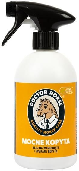 Mocne kopyta Olej do kopyt w sprayu 500 ml Doctor Horse specjalnie dla Ciebie i Twojego konia opracował olej do kopyt Mocne Kopyta. Recepturę oparł w 100% na wegańskich składnikach dbając jednocześnie o ich naturalne pochodzenie (100% składników naturalnych). Olej do kopyt Mocne Kopyta to starannie dobrana mieszanka olejów roślinnych dzięki którym odżywia, pielęgnuje i wzmacnia róg kopytowy Twojego Konia. Przy regularnym stosowaniu kopyta stają się odpowiednio nawilżone, elastyczne, mocne i błyszczące. Przeciwdziała wysychaniu i pękaniu kopyt utrzymując je w dobrym stanie. Sposób użycia Umyte i wilgotne kopyta obficie spryskać po podeszwach i ścianach kopyt do uzyskania wyraźnego połysku. Profilaktycznie stosować 1-2 razy w tygodniu. W przypadku problemów z pękającymi kopytami stosować codziennie. Trzymaj w pace lub skrzynce, nie zostawiaj na słońcu. Po otwarciu zużyć w przeciągu 2 miesięcy.