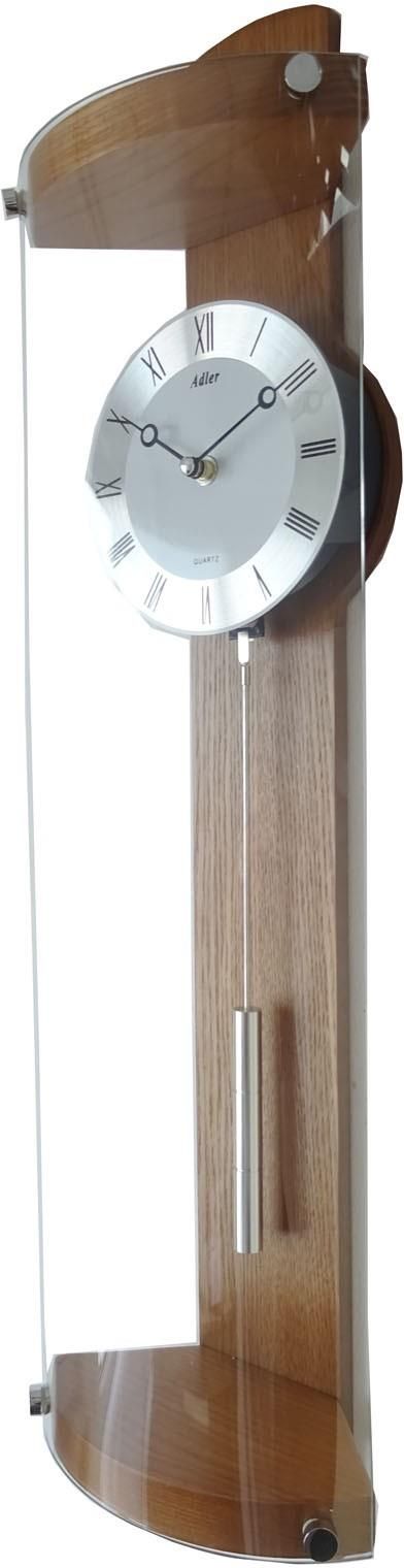 Zegar wiszący drewniany z wahadłem Adler Opis: Nowoczesny zegar ścienny z mechanizmem zasilanym na baterie. Obudowa składa się z tylnej, prostej drewnianej ścianki oraz frontowego przeszklenia. Szyba o profilu łukowym, zamocowana na profilach drewnianych i metalowych bolcach. Wszystkie elementy …