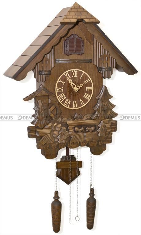 Zegar z kukułką drewniany kwarcowy Adler Opis: Klasyczny zegar ścienny z kukułką zasilany na baterie. Skrzynka zegara w kształcie domku z dachem o rzeźbionym pokryciu i dekoracją snycerską przedstawiającą pejzaż zimowy z choinkami i kołem młyna wodnego. Cyferblat i wskazówki drewniane. Ponad cyferblatem trzy okienka, środkowe z biało – zieloną kukułką. U dołu wahadło drewniane oraz dwa obciążniki na łańcuszkach w formie szyszek. Mechanizm regulowany za pomocą małego panelu ukrytego na lewej ściance bocznej zegara. Wysokość (bez wahadła i szyszek): 50 cm Szerokość: 42 cm Głębokość: 18 cm Waga: 2600 g Materiały: drewno Tarcza: drewniana z rzymskimi ozdobnymi cyframi Wskazówki: godzinowa i minutowa, wskazówki ażurowe, drewniane Wahadło: drewniane, ozdobne Mechanizm zegara: kwarcowy, 2 baterie R14 lub R6 („grube” lub „zwykłe” paluszki; nie załączone) Wyłącznik mechanizmu: zegar jest wyposażony w mały czujnik reagujący na światło. Jeśli w miejscu, gdzie wisi zegar jest wyłączone światło lub jest ciemno (w nocy) mechanizm automatycznie wyłącza funkcję kukania Mocowanie na ścianie: okrągły otwór z tyłu zegara Koszt Gospodarowania Odpadami: 0,36 PLN / sztukę