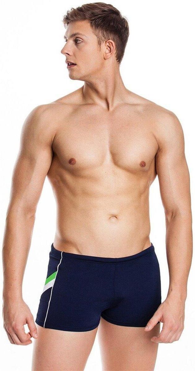 Męskie szorty pływackie z kolorowymi wstawkami i pipingiem wykonane z całkowicie chloroodpornej tkaniny Darwin.