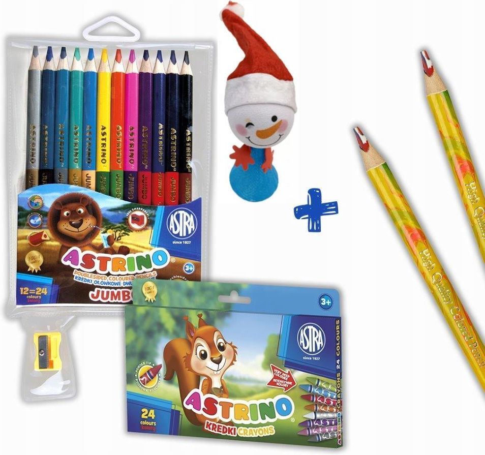 Zestaw artystyczny Astra obejmuje: kredki ołówkowe Astrino trójkątne dwustronne 12 = 24 kolory, kredki świecowe Astrino 24 kolory, kredki ołówkowe Astra Jumbo tęczowe, trójkątne - 2 szt. - produkt gratis. Kraj produkcji: PL Producent: ASTRA S.A. ul. Poleczki 23 02-822 Warszawa (PL) tel: (22) 346 07 …