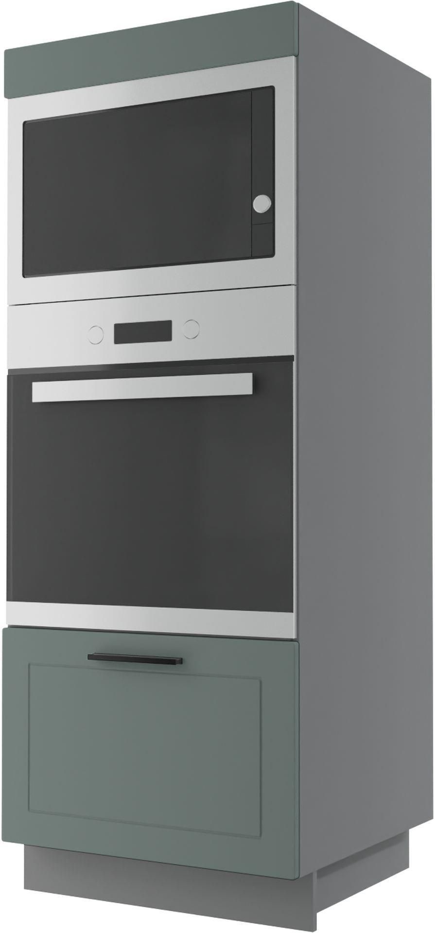 BERGAMO SŁUPEK POD ZABUDOWĘ PIEKARNIKA/MIKROFALÓWKI D5AE/60/154 HETTICH MIĘTOWY MAT to słupek do kuchni o wymiarach 60 cm szerokości, 154 cm wysokości oraz 56,5 cm głębokości. Prezentowane meble kuchenne miętowe wyróżniają się matowym wykończeniem oraz delikatnym frezem dekorującym fronty. Kolekcja kuchni Komfort została wzbogacona o system cichego domknięcia drzwi. Słupek do kuchni posiada wnękę przeznaczoną do montażu piekarnika i mikrofalówki, jak również pojemną szufladę z frontem miętowym w postaci foliowanej płyty MDF.