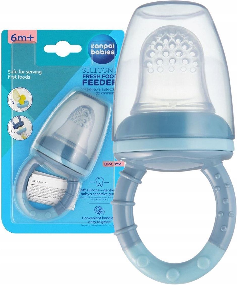 Canpol babies silikonowy gryzak do podawania pokarmów Symbol : 56/010_blu2 Silikonowa siateczka do karmienia sprawdzi się przy rozszerzaniu diety dziecka, ponieważ zmniejsza ryzyko zakrztuszenia się dużymi kawałkami jedzenia. Można w niej bezpiecznie podać maluchowi pierwsze owoce i warzywa. Siateczka ułatwia dziecku naukę samodzielnego gryzienia pokarmów. Wykonana jest z bezpiecznego, miękkiego silikonu. Łatwo utrzymać ją w czystości. Przeznaczona dla dzieci w wieku 6m+. Uniwersalne zastosowanie W środku gryzaka możemy umieści zmielone zupki, warzywa, owoce, czy kaszki. Dzięki temu gryzaczkowi łatwo nauczysz swoje maleństwo samodzielnego jedzenia, oraz wyrobisz zdrowe nawyki żywieniowe. Warzywa, czy zdrowe zupki nie będą się kojarzyć jako codzienny posiłek, ale świetna zabawa z gryzakiem. Gryzak swoim kształtem i kolorami zachęca dziecko do jedzenia, dzięki temu nawet największemu niejadkowi łatwo przemycisz między posiłkami dodatkowe witaminy. Pomaga to również w polubieniu dotąd nielubianych potraw. Dzięki temu, że gryzak jest w kształcie smoczka dziecko z chęcią będzie go używało. Smoczek jest miękki i silikonowy co sprawia, że jest bezpieczny dla wrażliwych ząbków dziecka. Nie zawiera bisfenolu. Produkt oprócz swojego zastosowania jest również świetnym zajęciem dla maluszka. Świetnie sprawdza się również jako smoczek, lub gryzak.