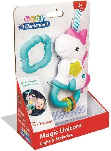 Zabawki linii Clementoni Baby pomagają rodzicom w komunikowaniu się z dzieckiem i wzajemnym oddziaływaniu na siebie od pierwszych dni jego życia. Wzornictwo i innowacyjne kolory, nietoksyczne i wytrzymałe materiały, wypukłości na powierzchni i różne funkcje sprzyjają rozwojowi sprawności wzrokowej, dotykowej i słuchowej, pobudzają aktywność ruchową oraz wywołują pierwsze skojarzenia logiczne. Magiczny jednorożec, który zabawia dziecko światłem i muzyką! Posiada lśniący przycisk w kształcie gwiazdki oraz kolorowe zawieszki, które wydają z siebie zabawne dźwięki, a także praktyczną obręcz, dzięki której grzechotkę można przymocować do kołyski lub wózka bądź też nosić przy sobie. Charakterystyka produktu: Magiczny jednorożec, który zabawia dziecko światłem i muzyką! Posiada lśniący przycisk w kształcie gwiazdki oraz kolorowe zawieszki, które wydają z siebie zabawne dźwięki. Posiada praktyczną obręcz, dzięki której grzechotkę można przymocować do kołyski lub wózka bądź też nosić przy sobie. Bajkowa kolorystyka przyciągająca uwagę maluszka. Zabawka wykonana z nietoksycznych, bezpiecznych dla dziecka materiałów. Zabawka posiada elektroniczne światła i dźwięki. Zasilanie: 3 x AG13 1,5V, baterie testowe w zestawie Wymiary opakowania: 22 x 15 x 7 cm.