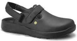 Elten Michel ESD SB — klapki robocze męskie z podnoskami ochronnymi Eleganckie czarne chodaki MICHEL ESD SB to wygodne klapki ochronne, wyposażone w stalowe podnoski chroniące przed zagrożeniami z góry. Pasek na piętę oraz praktyczne zapięcie na rzep w okolicy podbicia zapewniają szybkie i indywidualne dopasowanie do stopy. Alergicy czerpią korzyści z faktu, że model MICHEL nie zawiera skóry, co eliminuje ryzyko wystąpienia objawów alergii na garbniki. Chodaki wykonane są z lekkiej, wytrzymałej mikrofibry. Oddychająca tekstylna wyściółka chodaków zapewnia wyjątkowy komfort, wilgoć powstająca wewnątrz jest wchłaniana i odprowadzana na zewnątrz, co zapewnia większą świeżość stóp. Podeszwa MONO-PU C-FIT, opracowana specjalnie dla serii chodaków ELTEN, chroni przed mimowolnymi poślizgami na wilgotnej, śliskiej podłodze. Buty MICHEL ESD SB produkowane są w dwóch kolorach (czarny i biały) i są dostępne dla osób noszących rozmiary butów od 40 do 46. ROZMIARY 40-46 NORMY I CERTYFIKATY EN ISO 20345 SB A E FO SRC