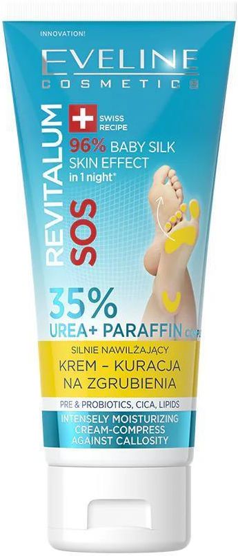 Eveline Cosmetics Revitalum SOS Nawilżający Krem do stóp na zgrubienia Produkt idealny dla osób zmagających się z problemem zrogowaciałej, twardej skóry na piętach i stopach. Rozwiązanie dedykowane każdemu, kto pragnie odzyskać komfort i gładkość stóp w krótkim czasie. Efekt "baby silk"widoczny jest już po pierwszej nocy stosowania. Dzięki swojej formule krem jest idealny zarówno dla osób aktywnych, które chcą zadbać o estetykę i zdrowie swoich stóp, jak i dla tych, którzy cierpią na nadmierne przesuszenie czy dyskomfort związany z pękającą skórą. Kluczowe składniki aktywne Mocznik – działa nawilżająco i złuszczająco, pomaga usuwać martwy naskórek i zmiękcza twarde obszary skóry. Parafina – regeneruje, tworzy warstwę ochronną i zatrzymuje wilgoć w skórze. CICA (Centella Asiatica) – działa przeciwzapalnie i regenerująco, przyspieszając procesy gojenia. Pre i probiotyki – wzmacniają barierę ochronną skóry i pomagają utrzymać jej naturalną mikroflorę. Lipidy – odbudowują barierę hydrolipidową, zapewniając odpowiednie nawilżenie i ochronę przed czynnikami zewnętrznymi. Revitalum SOS Nawilżający Krem do stóp na zgrubienia Gwarantuje efekt „baby silk” już po jednej nocy. Skutecznie eliminuje nawet najbardziej uporczywe zrogowacenia. Regeneruje i nawilża skórę stóp, zapewniając długotrwały komfort. Oparty na recepturze z zaawansowanymi składnikami aktywnymi. Łatwy w aplikacji – idealny do codziennej pielęgnacji. Produkt wegański. Sposób użycia: Nałóż cienką warstwę kremu na obszary stóp narażone na zrogowacenia, np. pięty czy śródstopie. Pozostaw na skórze przez całą noc dla optymalnych efektów. Dla lepszych rezultatów stosuj produkt regularnie. Skład produktu: Aqua (Water), Urea, Paraffinum Liquidum, Glycerin, Cetearyl Alcohol, Glyceryl Stearate, Glyceryl Stearates, PEG-100 Stearate, Sodium Lactate, Butyrospermum Parkii Butter, Persea Gratissima Oil, Olus Oil, Centella Asiatica Leaf Extract, Alpha-Glucan Oligosaccharide, Polymnia Sonchifolia Root Juice, Lactobacillus, Allantoin, Panthenol, Lactic Acid, Tocopherol, Phenoxyethanol, Ethylhexylglycerin, Sodium Benzoate, Parfum (Fragrance), Triacetin, Behenyl Alcohol, Carbomer, Xanthan Gum,Maltodextrin, BHT, Disodium EDTA, Citric Acid, Benzyl Salicylate, Hexyl Cinnamal, Linalool, Tetramethyl Acetyloctahydronaphthalenes. Listy składników dla produktów naszej marki są regularnie aktualizowane. Zapoznaj się z listą składników na opakowaniu produktu, gdzie zawsze znajduje się najbardziej aktualna lista składników, aby upewnić się, że jest ona dla Ciebie odpowiednia. Krem-kuracja z linii Revitalum to intensywnie nawilżający produkt, stworzony z myślą o skutecznym zwalczaniu zrogowaceń i suchej skóry stóp. Dzięki innowacyjnej formule opartej na 35% kompleksie z mocznikiem i parafiną działa już po jednej nocy, pozostawiając skórę miękką i gładką. Seria: Revitalum SOS Pojemność: 75 ml